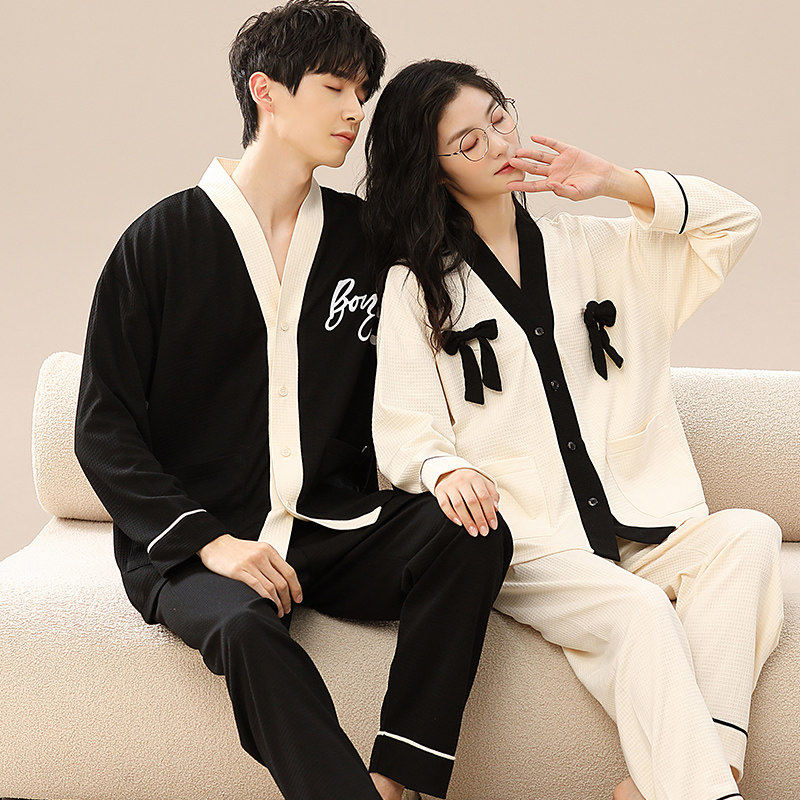 安比斯情侣睡衣舒适纯棉秋季女长袖男女同款休闲家居服套装可出门