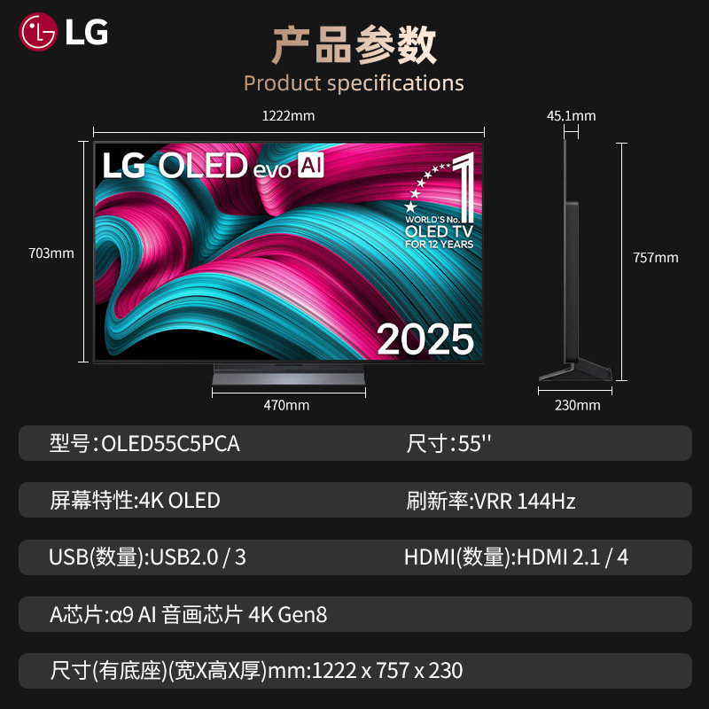 LG 55英寸OLED平板电视机电竞游戏智能4K 144HZ OLED55C5PCA 151
