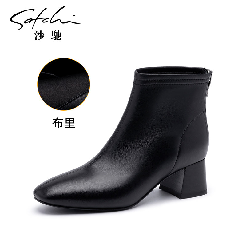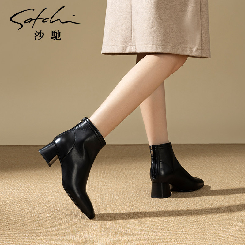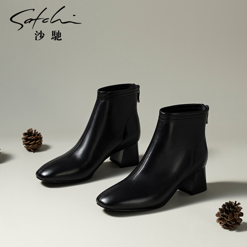 沙驰女鞋小方头通勤短靴女士短筒时装靴2025冬季新款粗跟羊皮靴子