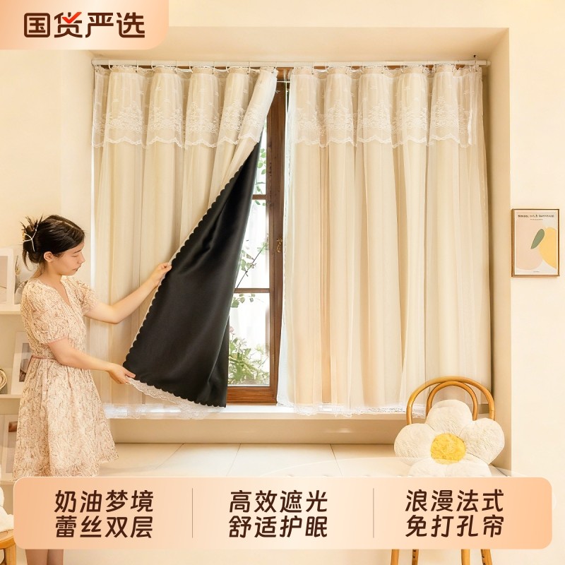 奶油风蕾丝双层帘窗帘加厚遮光法式梦幻纯色系免打孔帘卧室门帘新