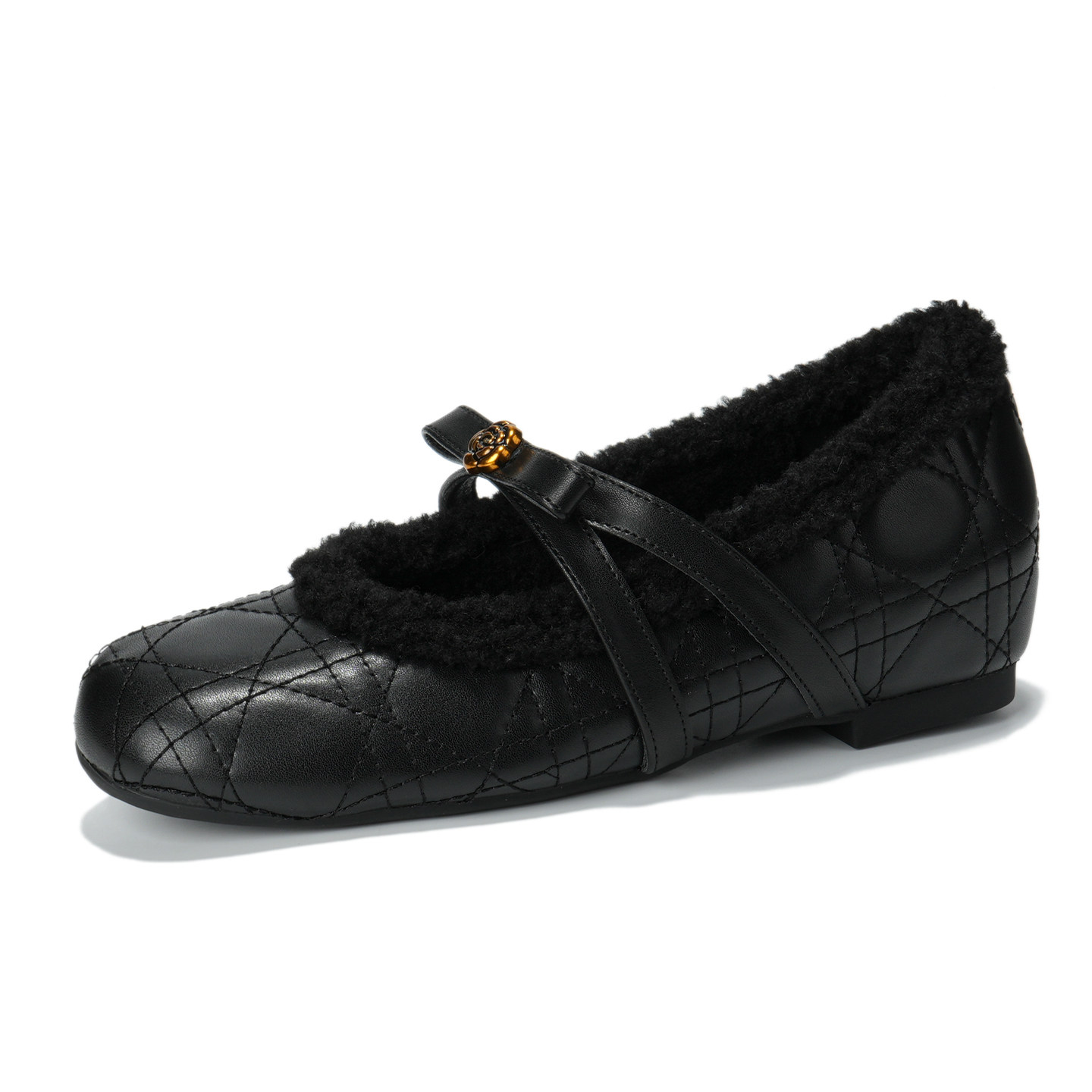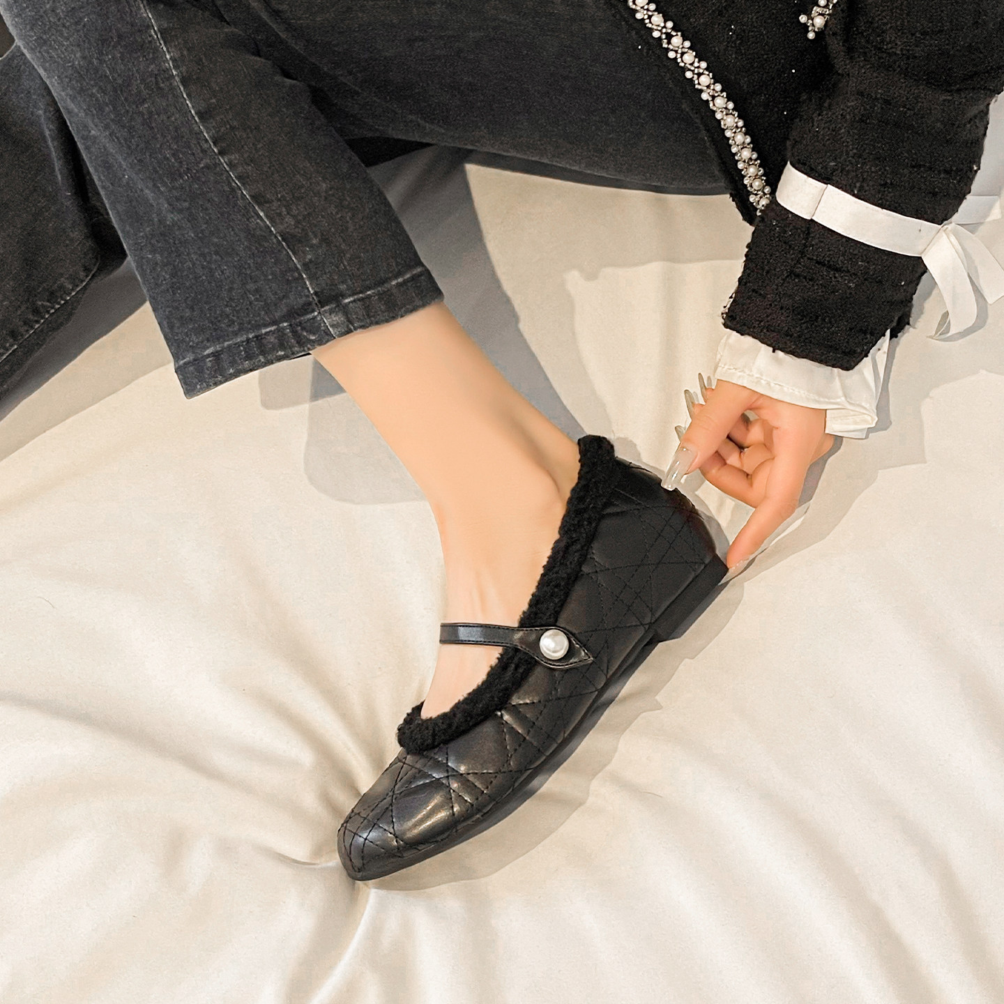 羊皮版复古玛丽珍鞋女方头秋冬季加绒保暖毛毛棉鞋平底晚晚单鞋女