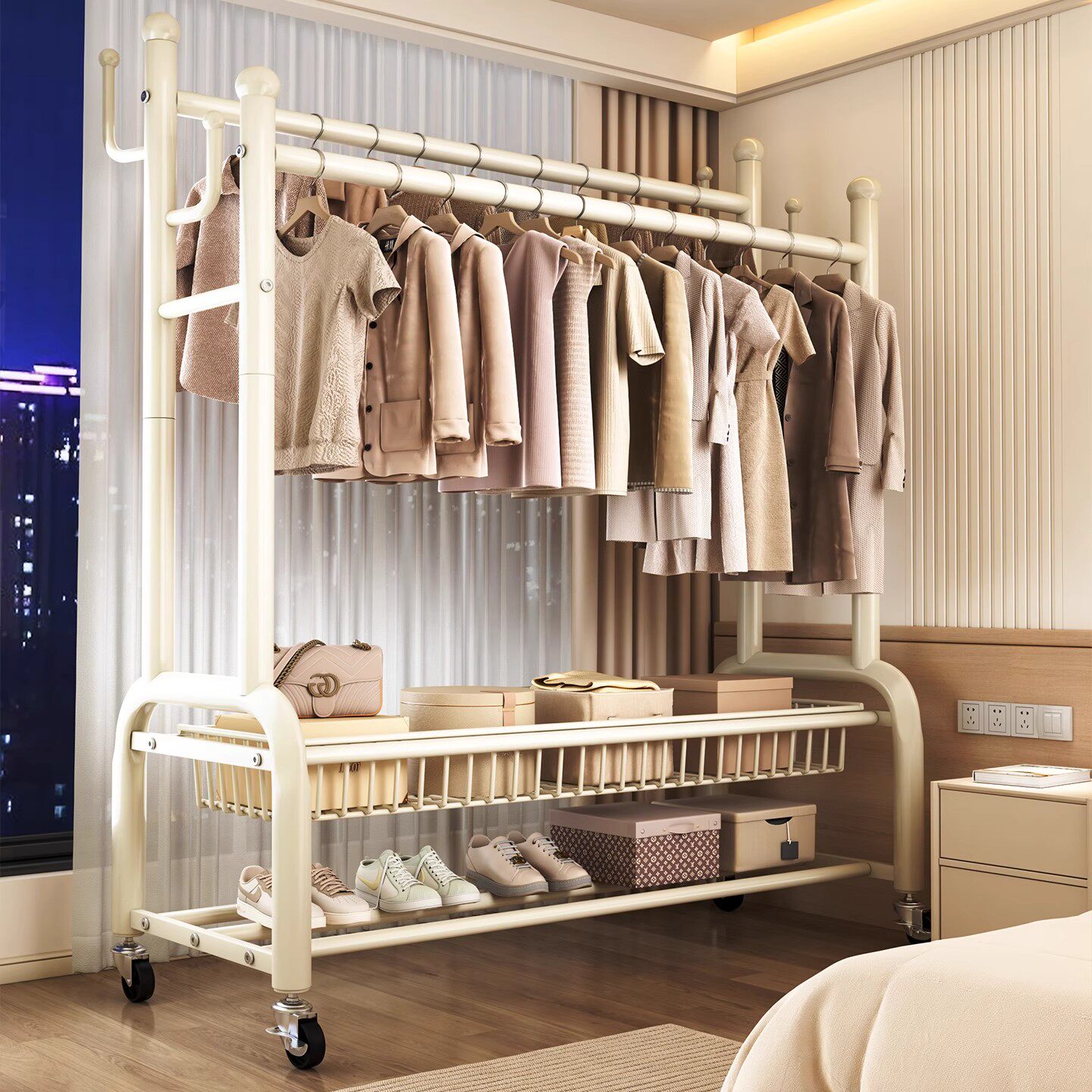衣架落地卧室奶油风挂衣架家用铁艺简易晾衣架室内客厅移动衣帽架
