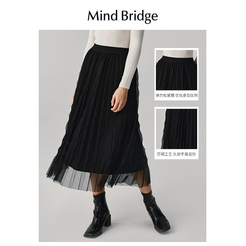 Mind Bridge2026年春季复古纯色百褶裙女士中长款半身裙网纱裙子