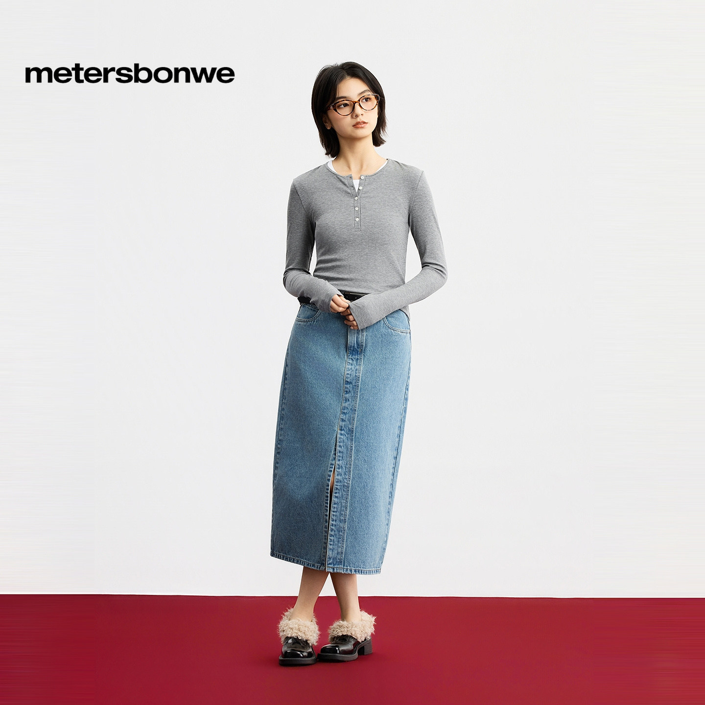 美特斯邦威T恤女2026春季新款时尚半开领修身内搭可外穿打底衫
