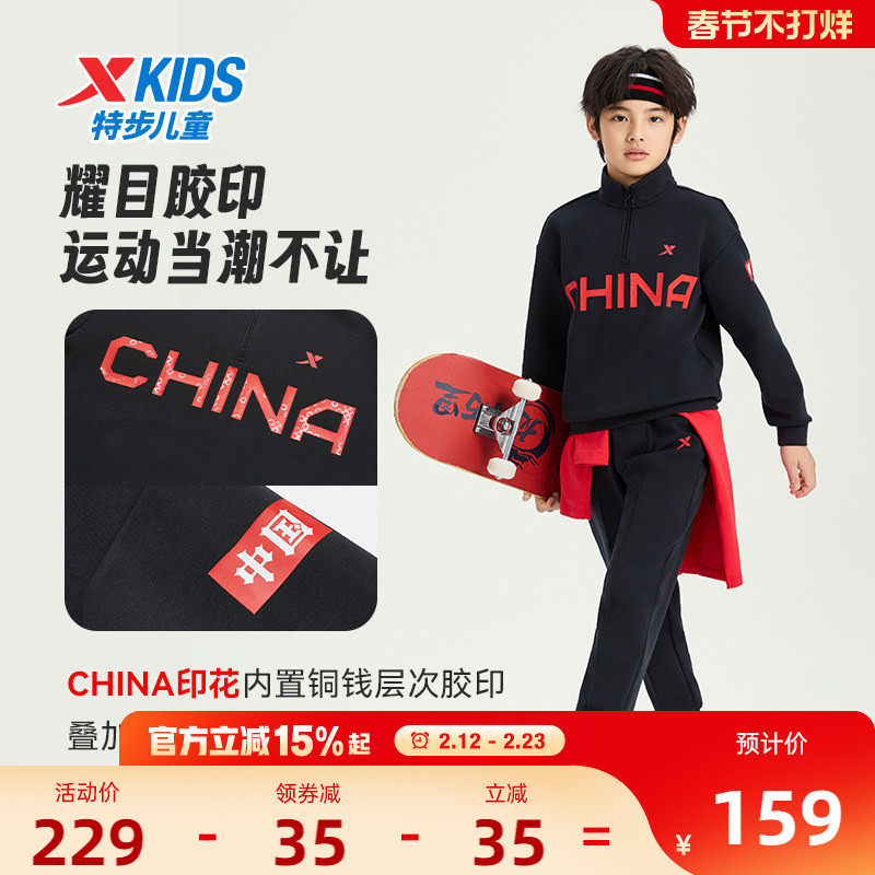 特步童装男童长袖国潮套装2026冬季儿童立领卫衣长裤两件套运动服