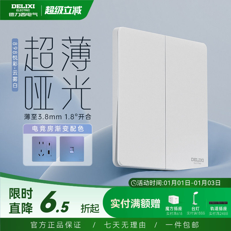 德力西超薄开关插座奶油风五孔面板86型16a家用暗装898PC云雾白