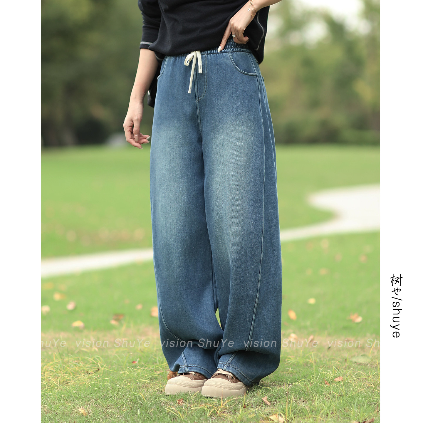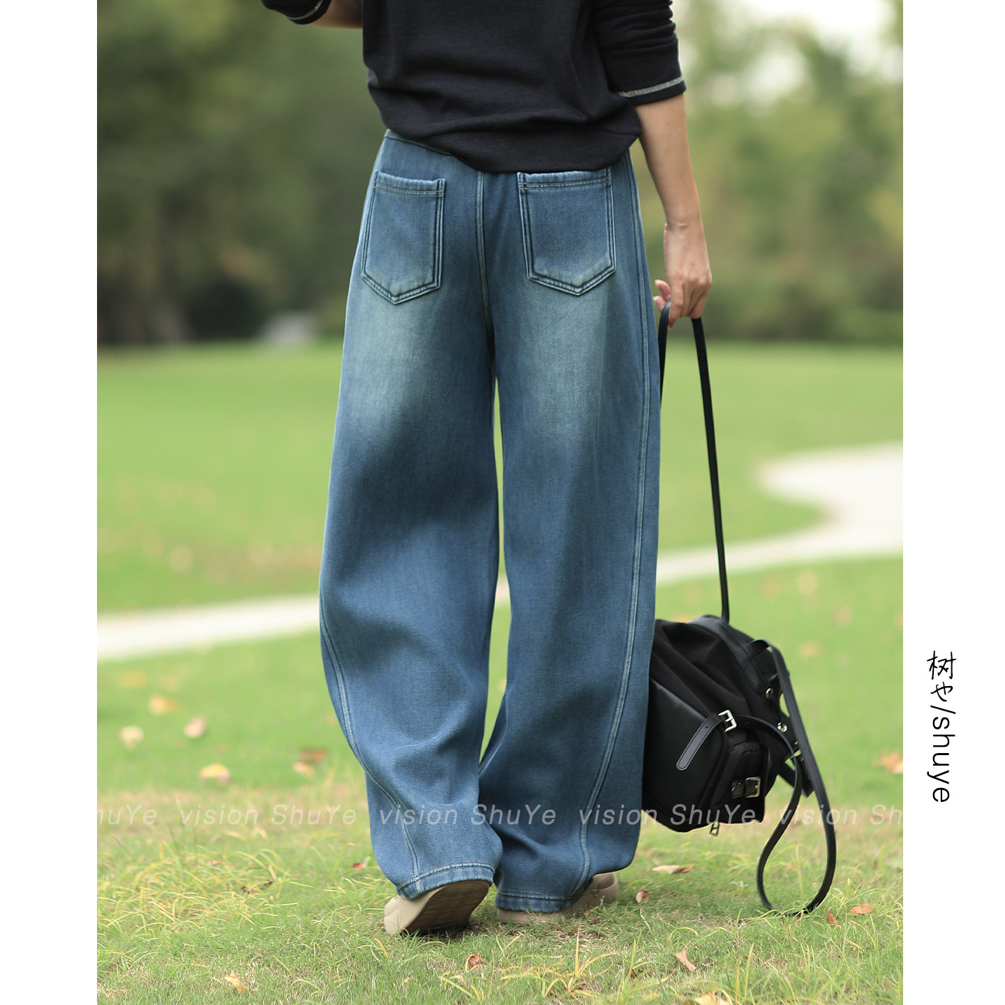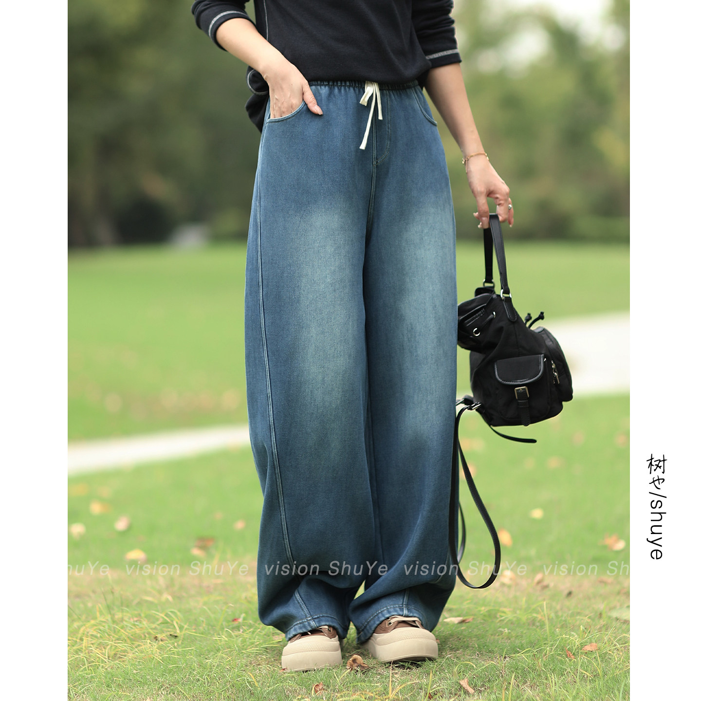 艾恩晟 2025早春美式宽松垂感牛仔阔腿裤深蓝色系慵懒风ins博主风
