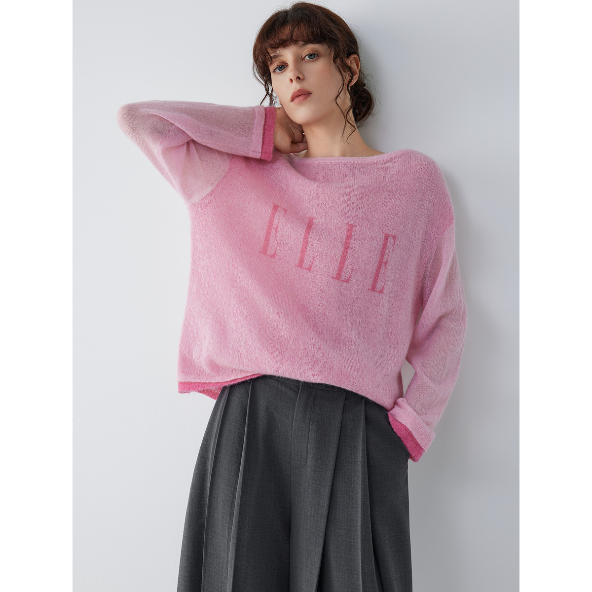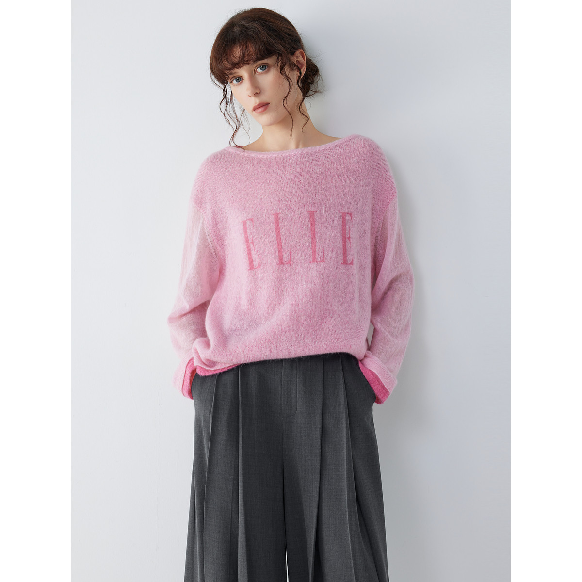 ELLE粉色马海毛大圆领针织衫女2025秋季新款绵羊毛宽松软糯毛衣