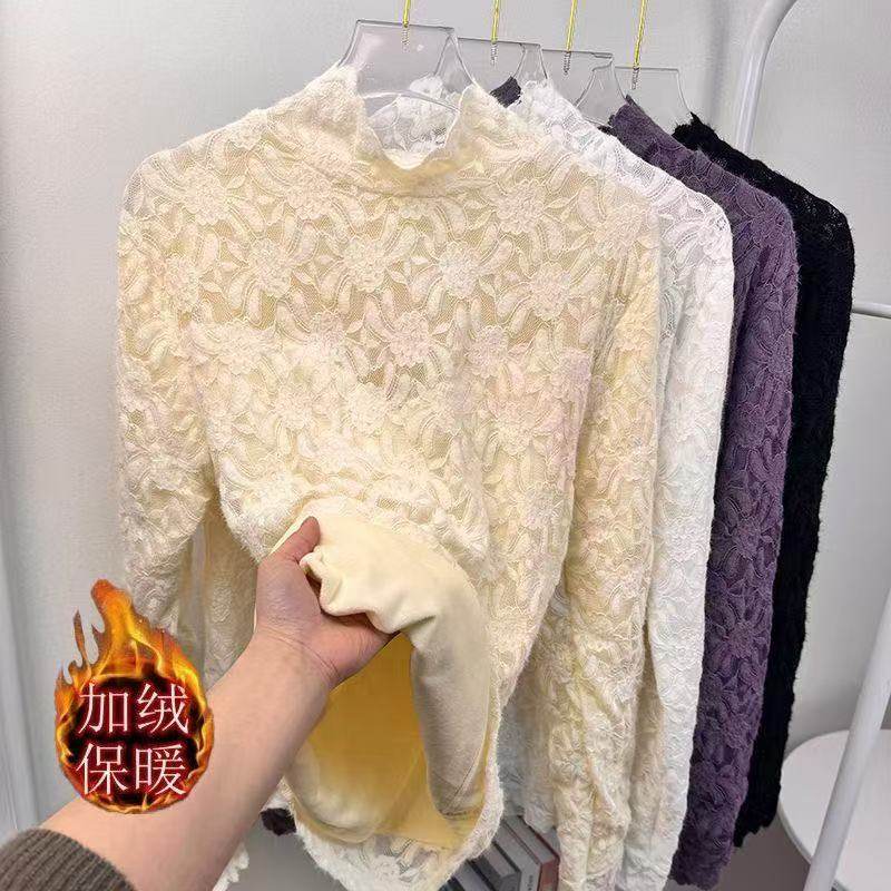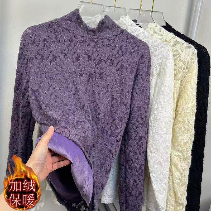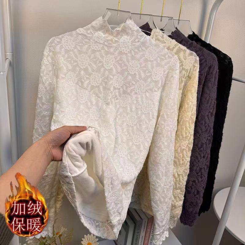 2025秋冬新款加绒保暖蕾丝提花长袖打底衫修身显瘦半高领内搭上衣