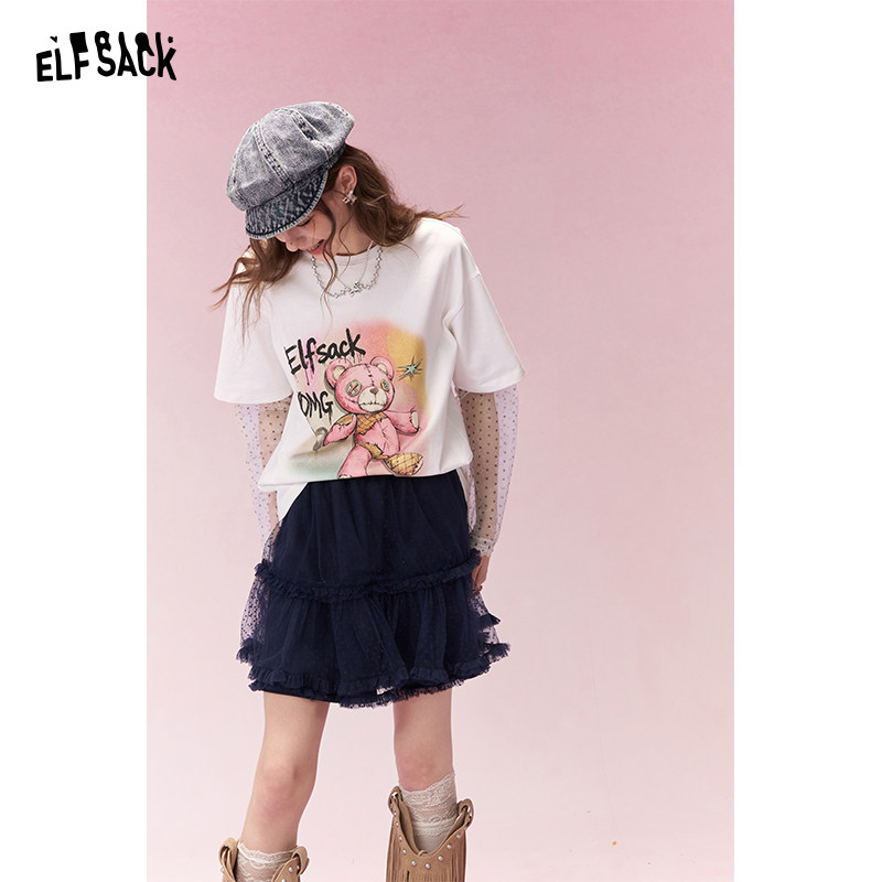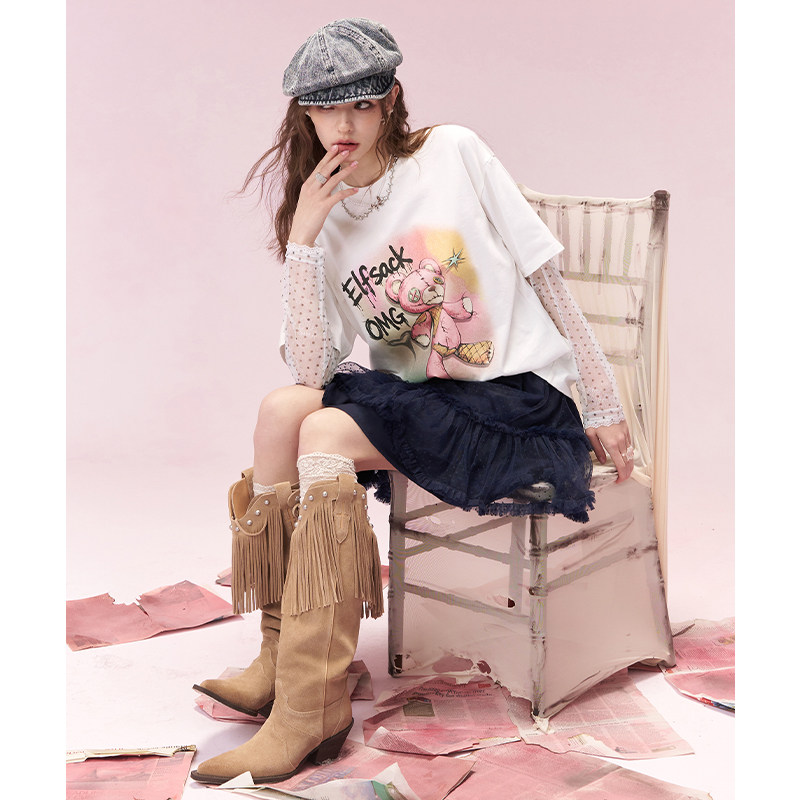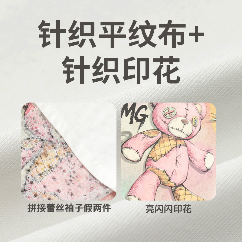 妖精的口袋假两件蕾丝拼接印花长袖t恤女2026年早春新款宽松上衣