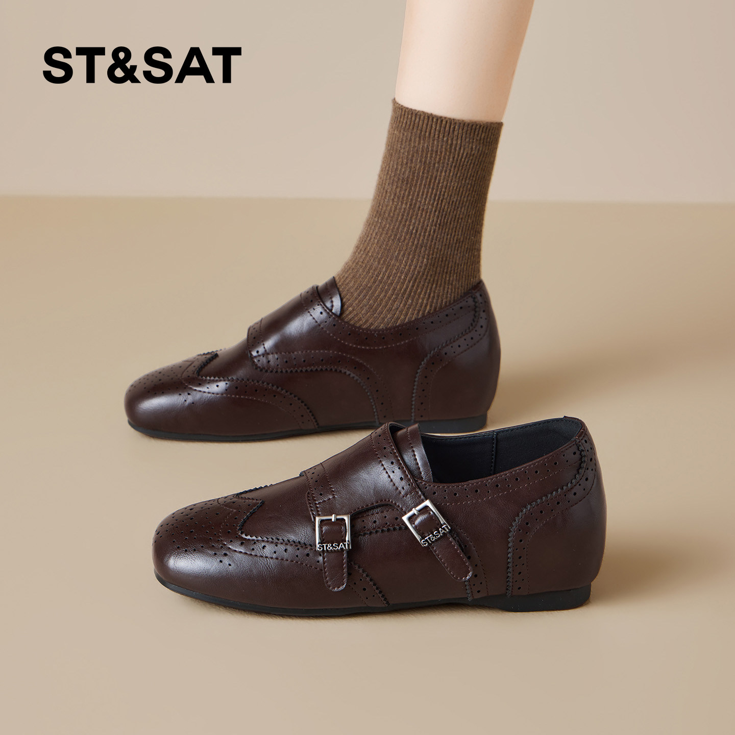 星期六棕色布洛克乐福鞋女2026春季款英伦风双扣带复古雕花小皮鞋