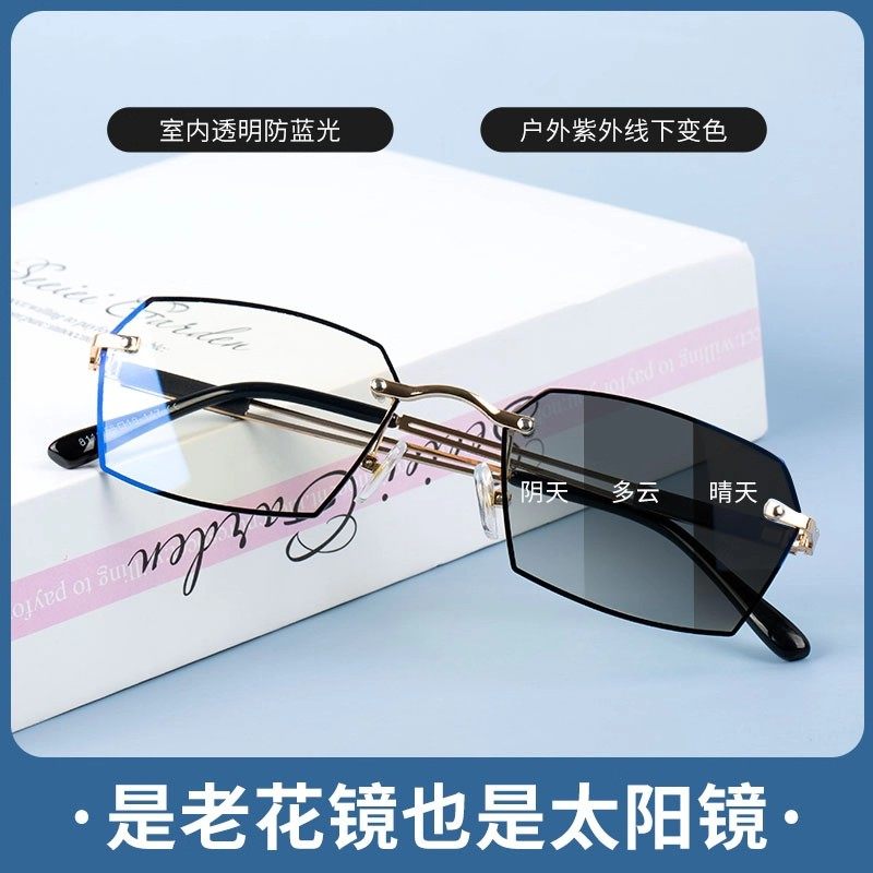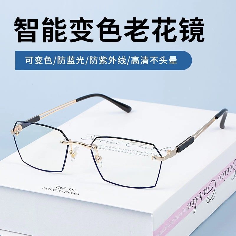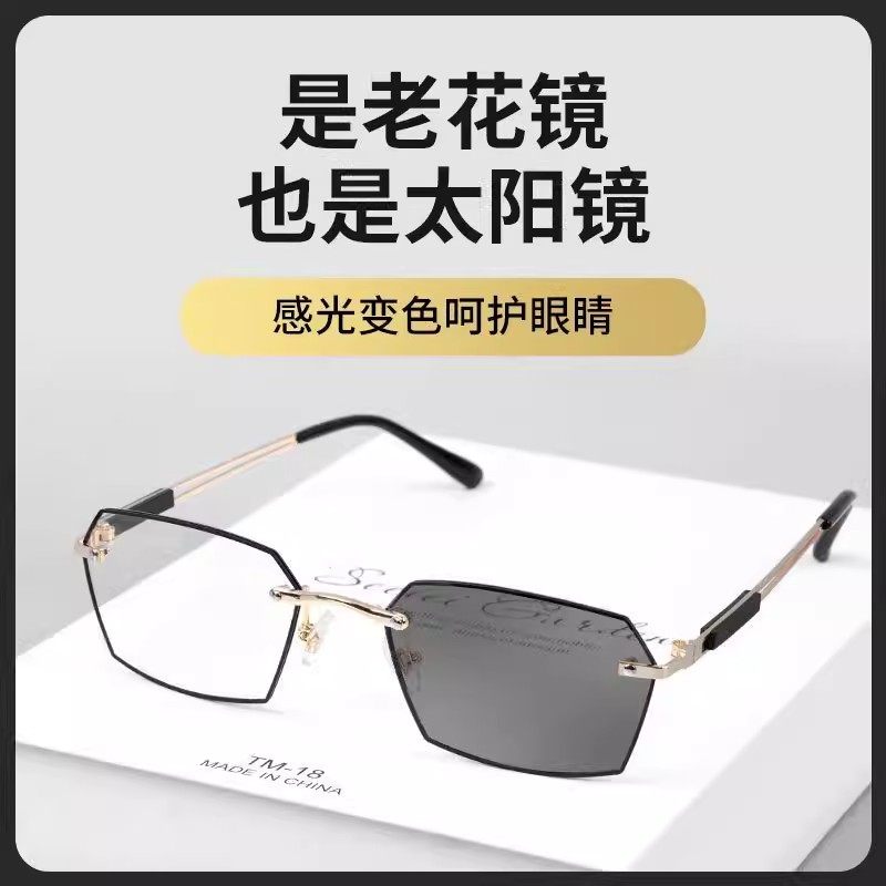 无框商务变色老花镜男中老年高清防蓝光防辐进口镜片两用老光镜
