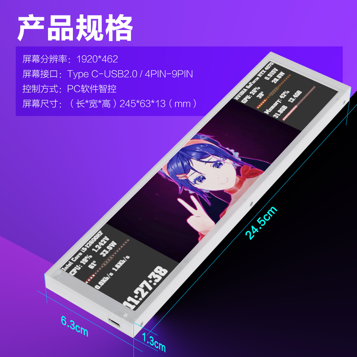 妙联宝D92电脑机箱副屏海景房主机长条屏CPU温度显示屏桌面小屏幕