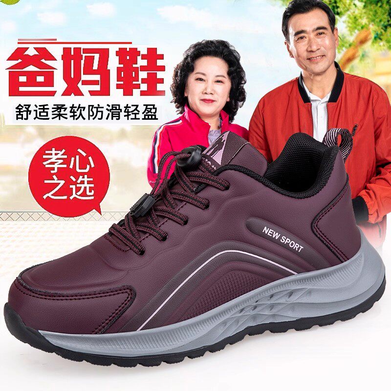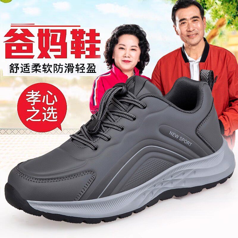 老人健步鞋秋冬新款皮面防水防滑软底女妈妈鞋中老年爸爸运动鞋