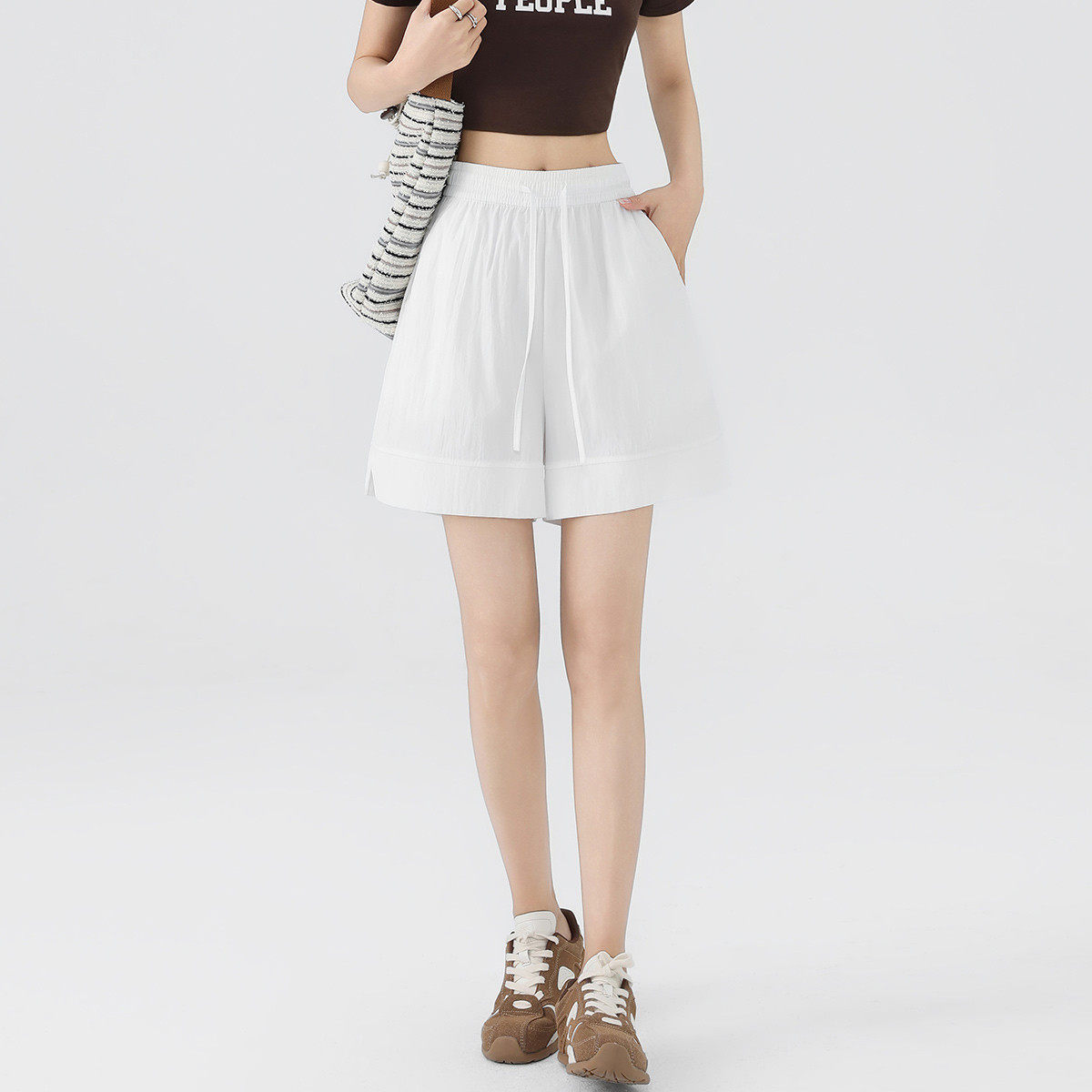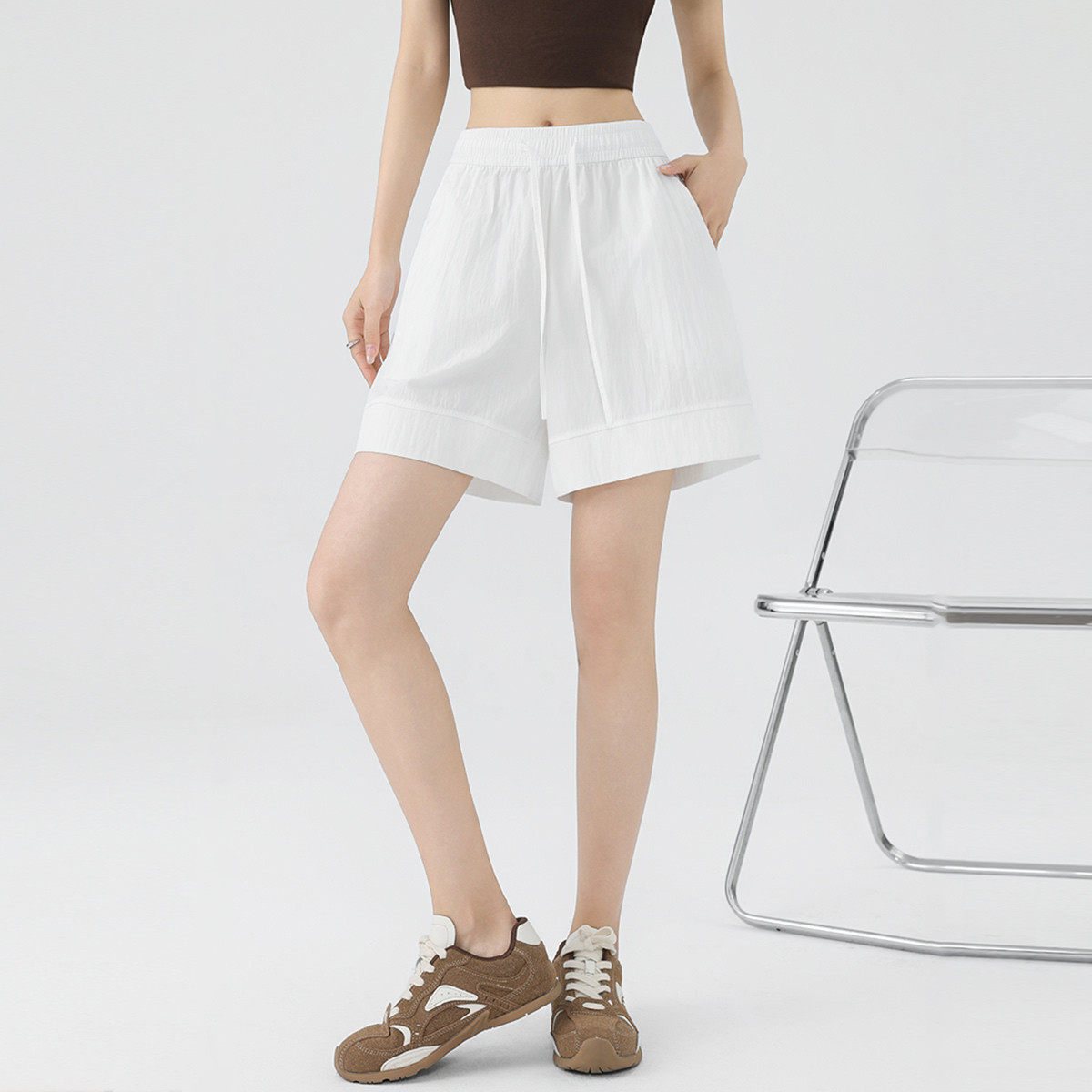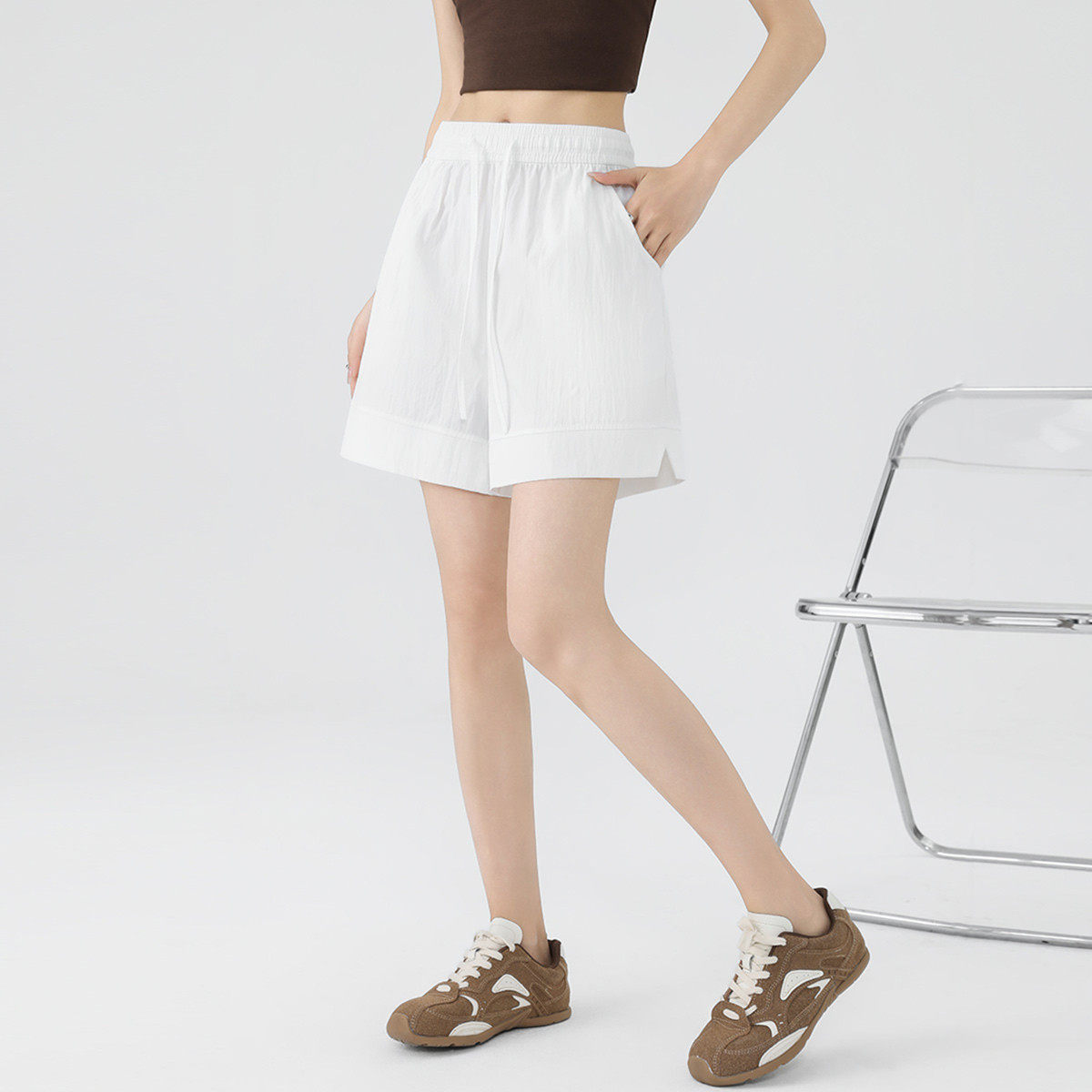 one more松紧腰三分A字休闲热裤2025夏季新款运动短裤显瘦阔腿裤