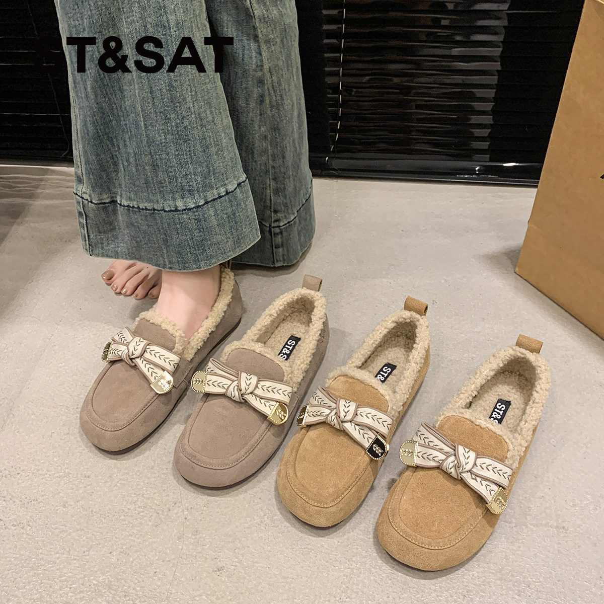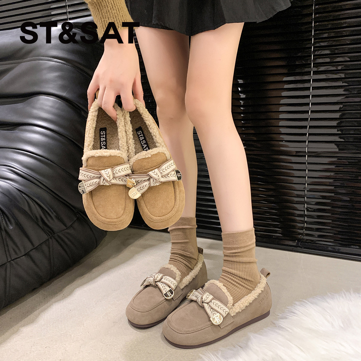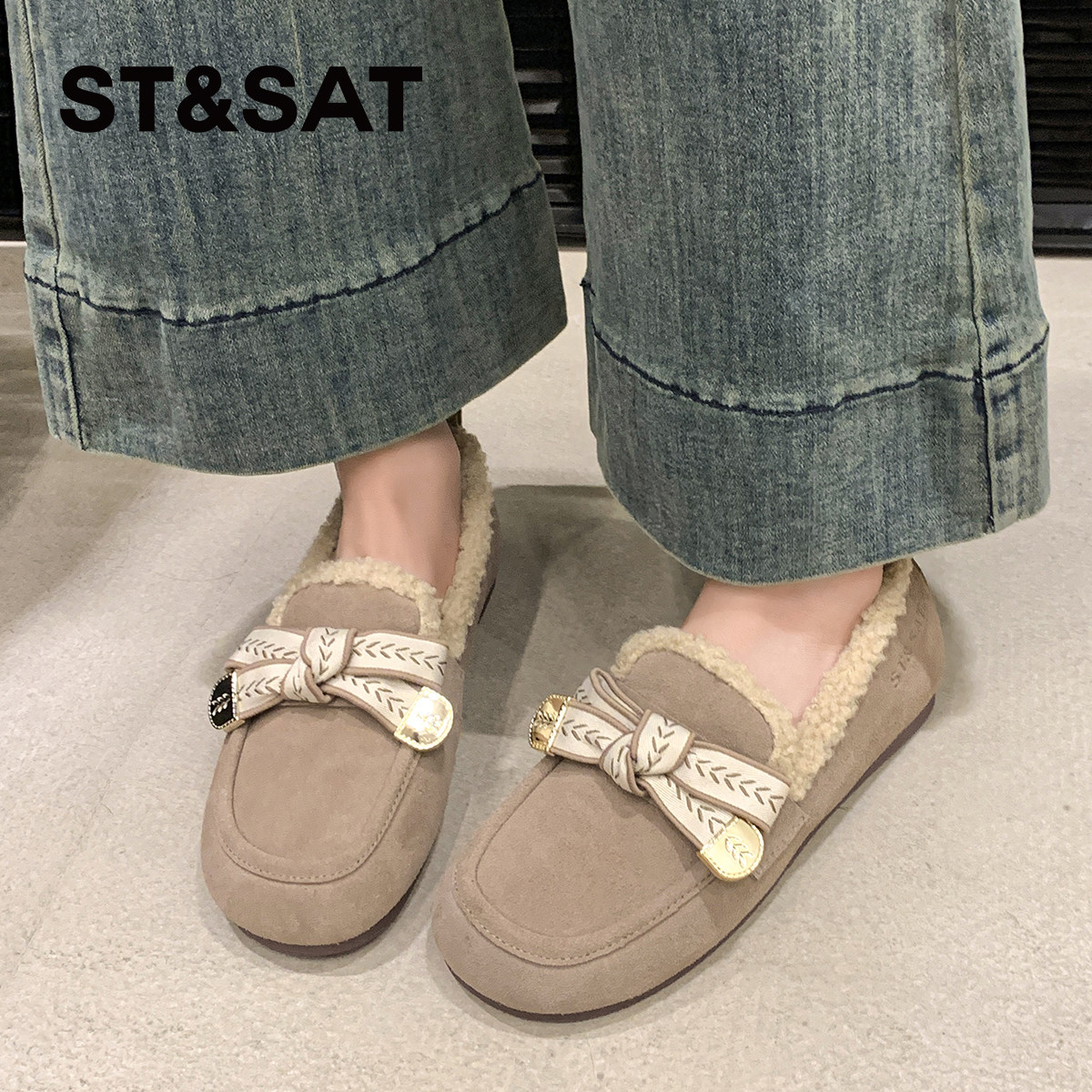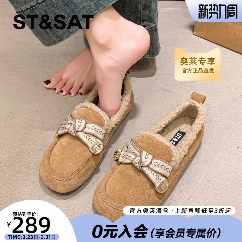 星期六真皮加绒毛毛单鞋女冬季新款舒适软底百搭保暖豆豆鞋