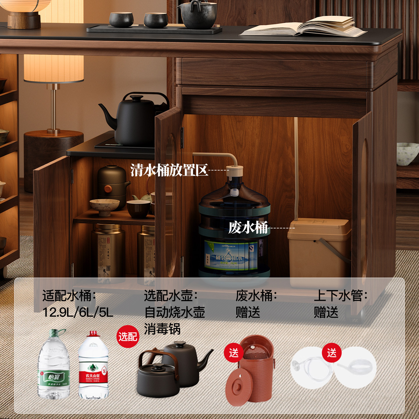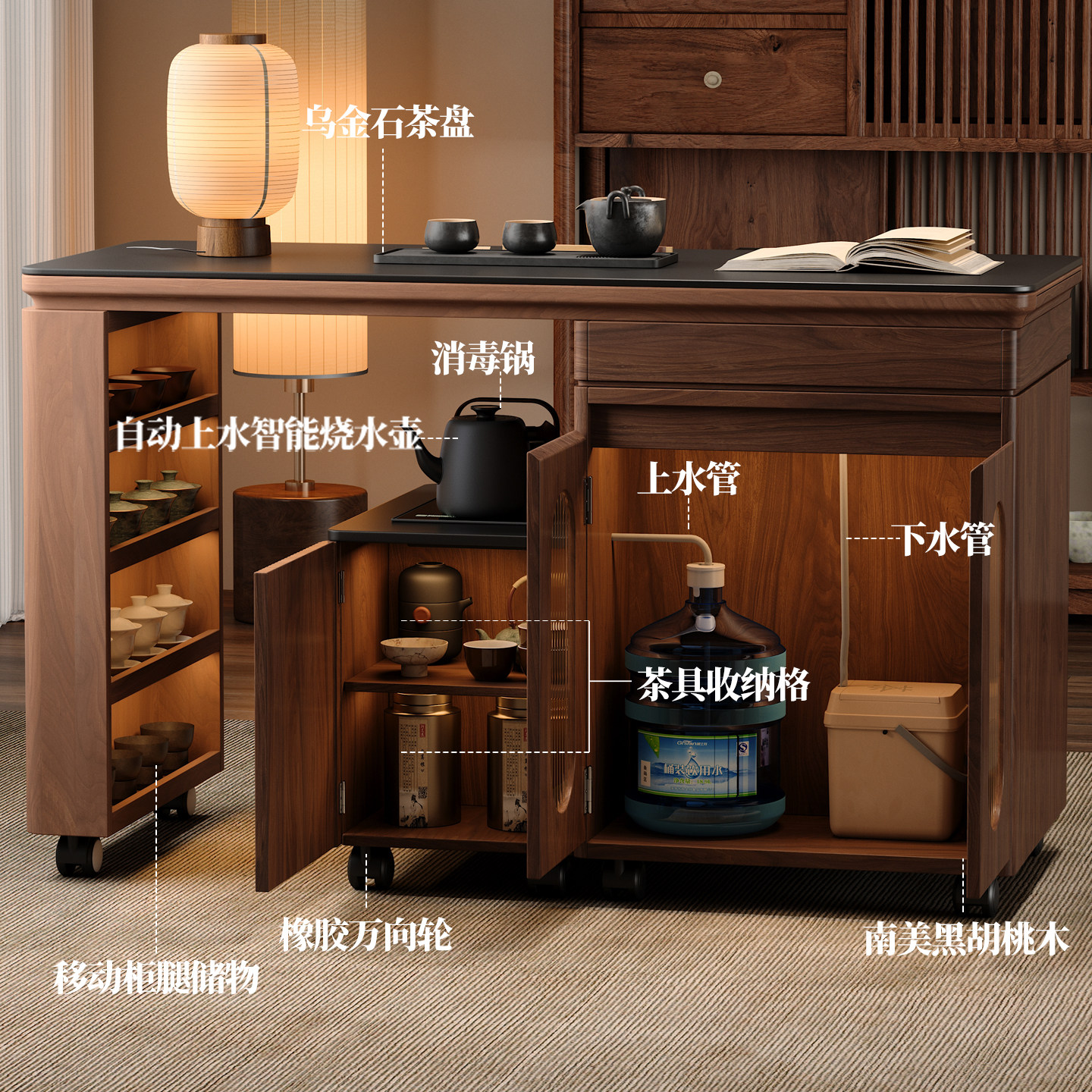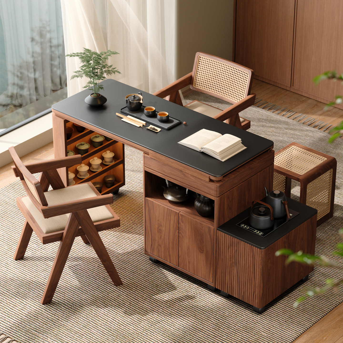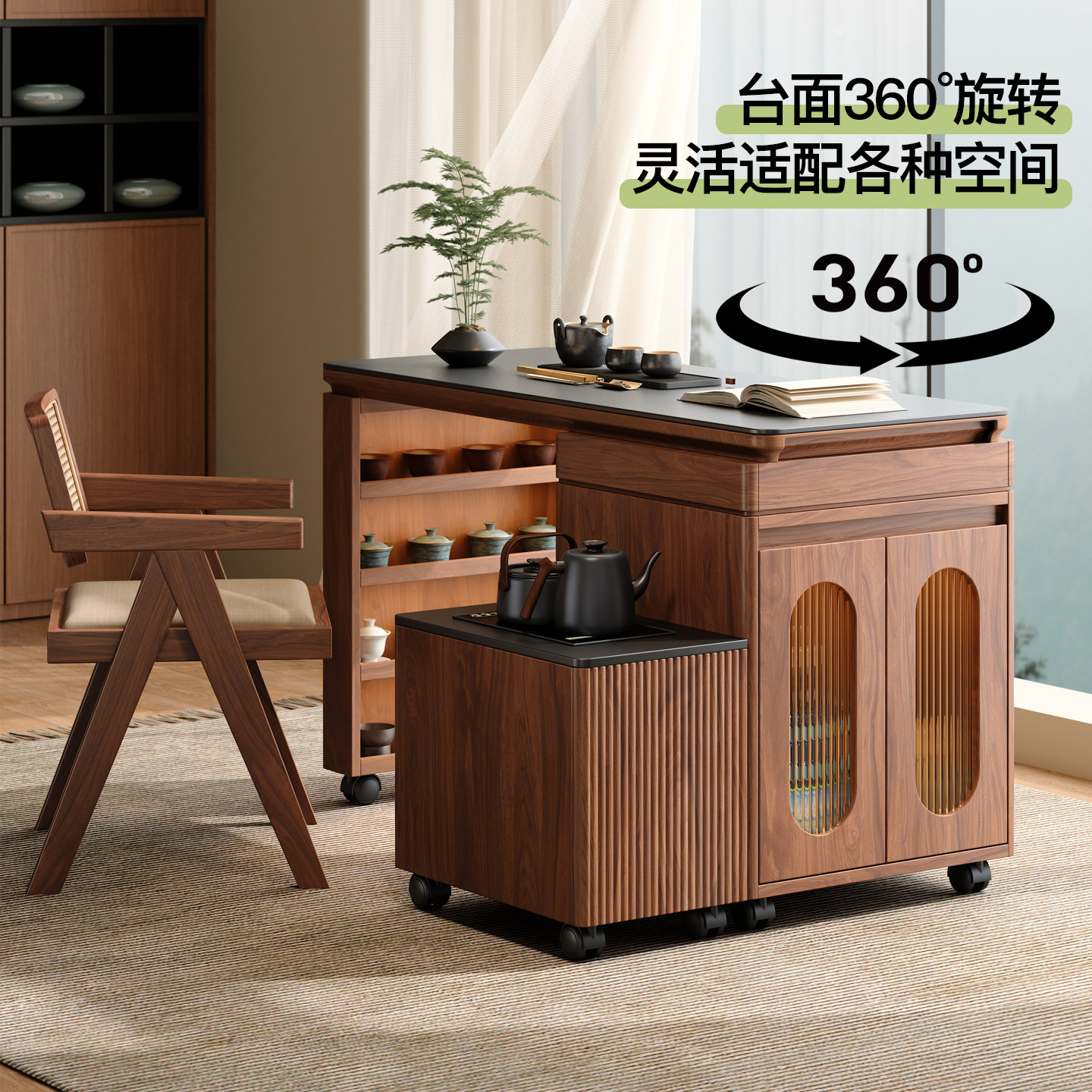 木小咖隐格家用实木茶桌小户型茶台阳台可伸缩旋转茶水边柜带储物