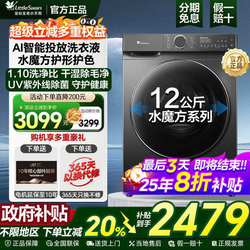 [国补20%水魔方12公斤]小天鹅洗衣机全自动家用滚筒洗脱烘618PLUS