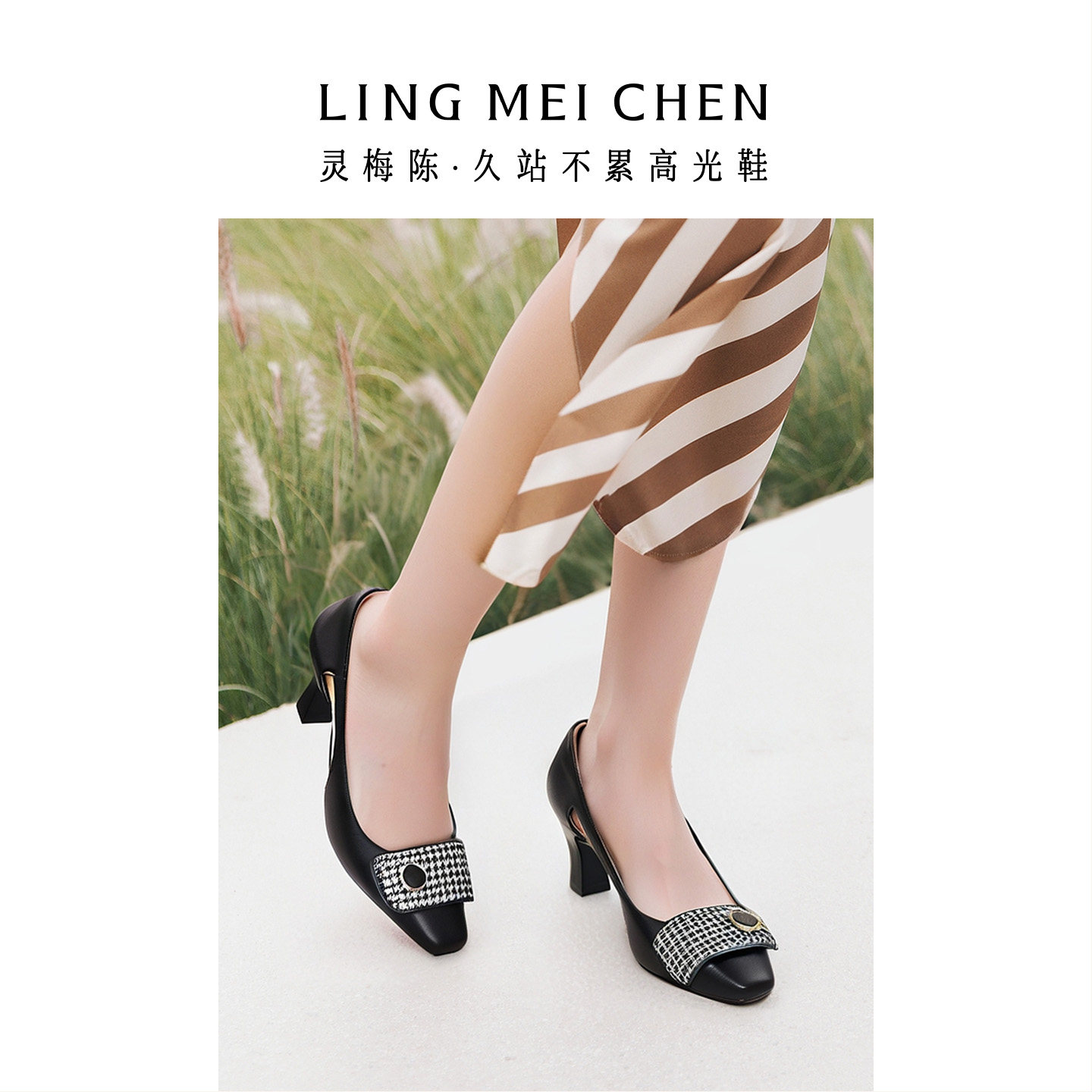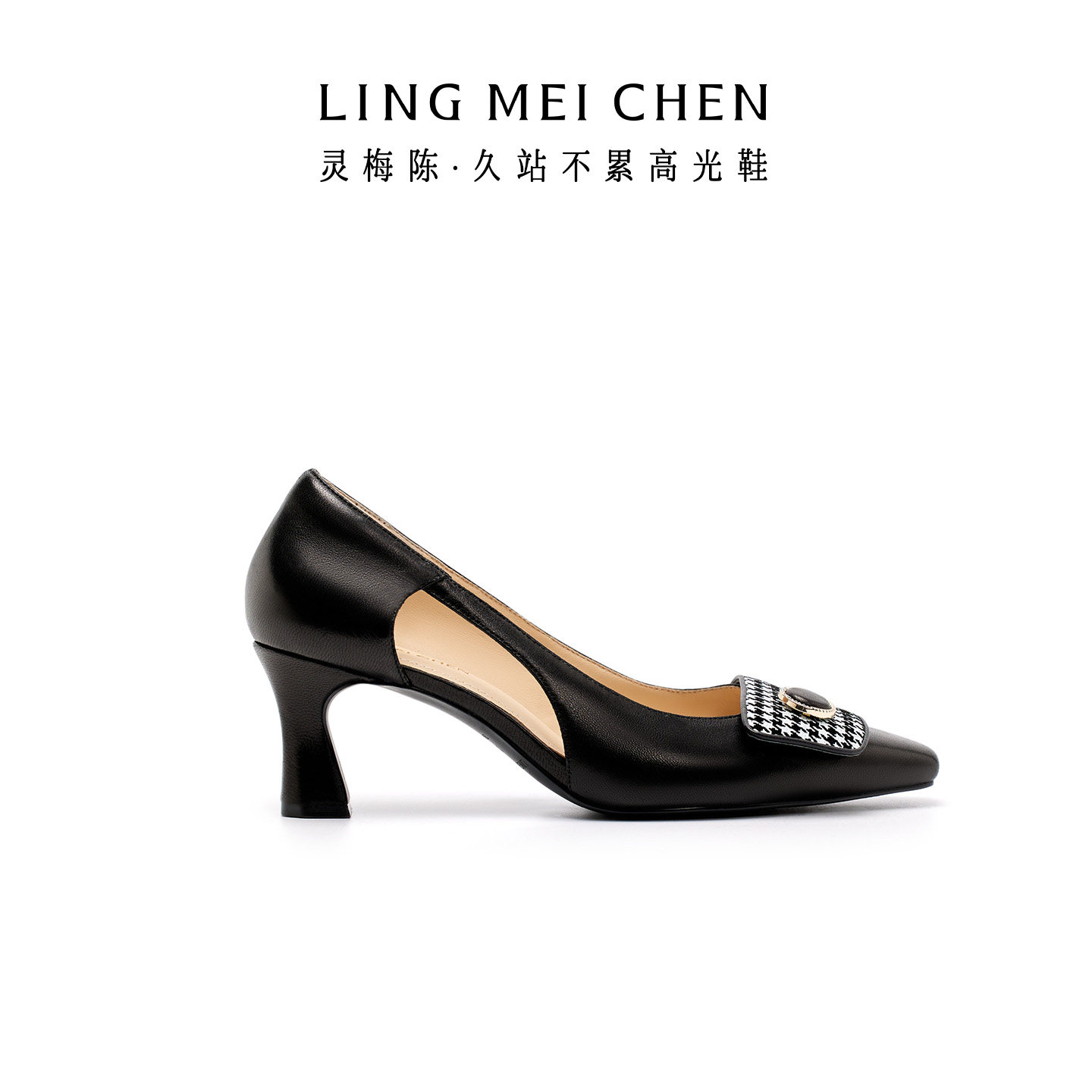 LINGMEICHEN千鸟格高跟鞋2026新款羊皮法式浅口皮鞋女款粗跟单鞋