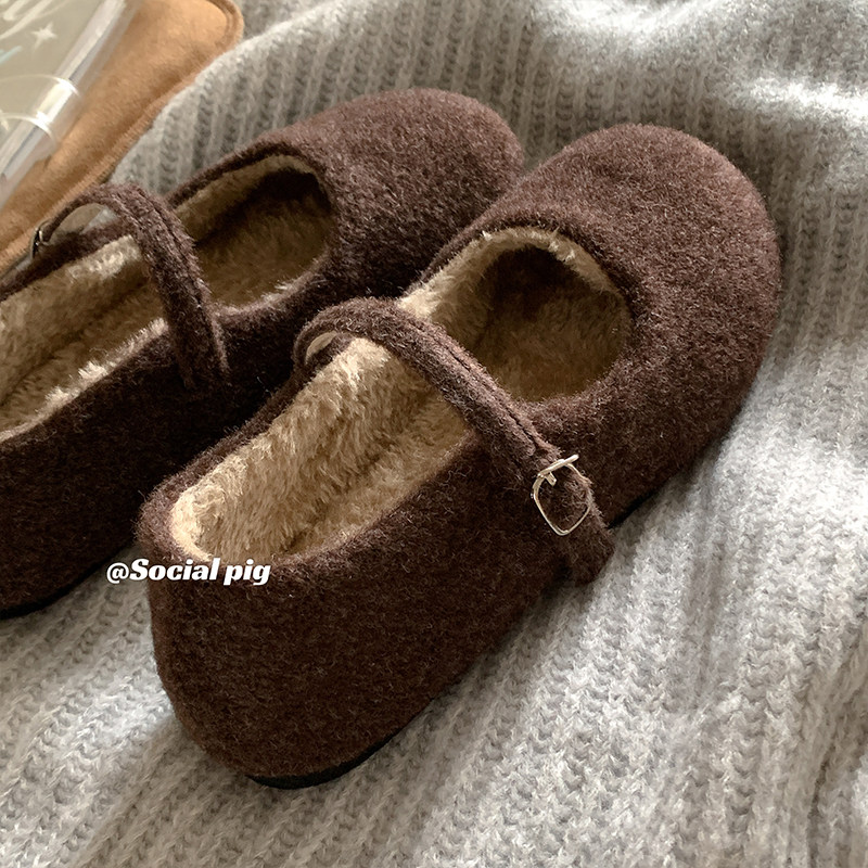 羊皮版复古玛丽珍鞋女方头秋冬季加绒保暖毛毛棉鞋平底晚晚单鞋女