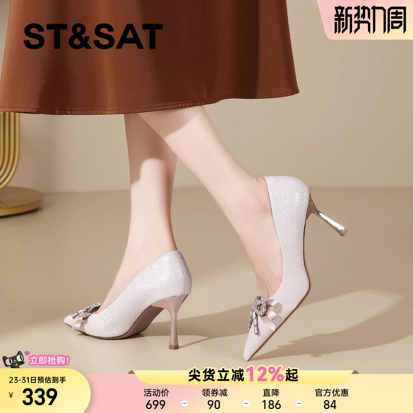 星期六优雅风水钻蝴蝶结婚鞋女2026年春季新款尖头细跟单鞋高跟鞋