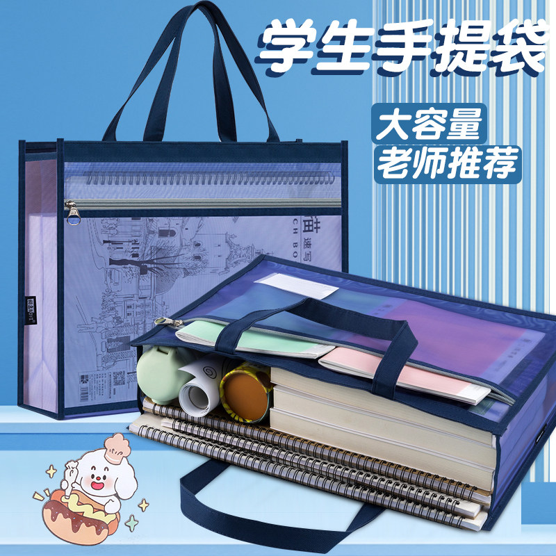 科目分类文件袋透明拉链式a4收纳拎书课外班作业男女孩书包小学初中生l型考试试卷学科补习网纱手提袋大容量