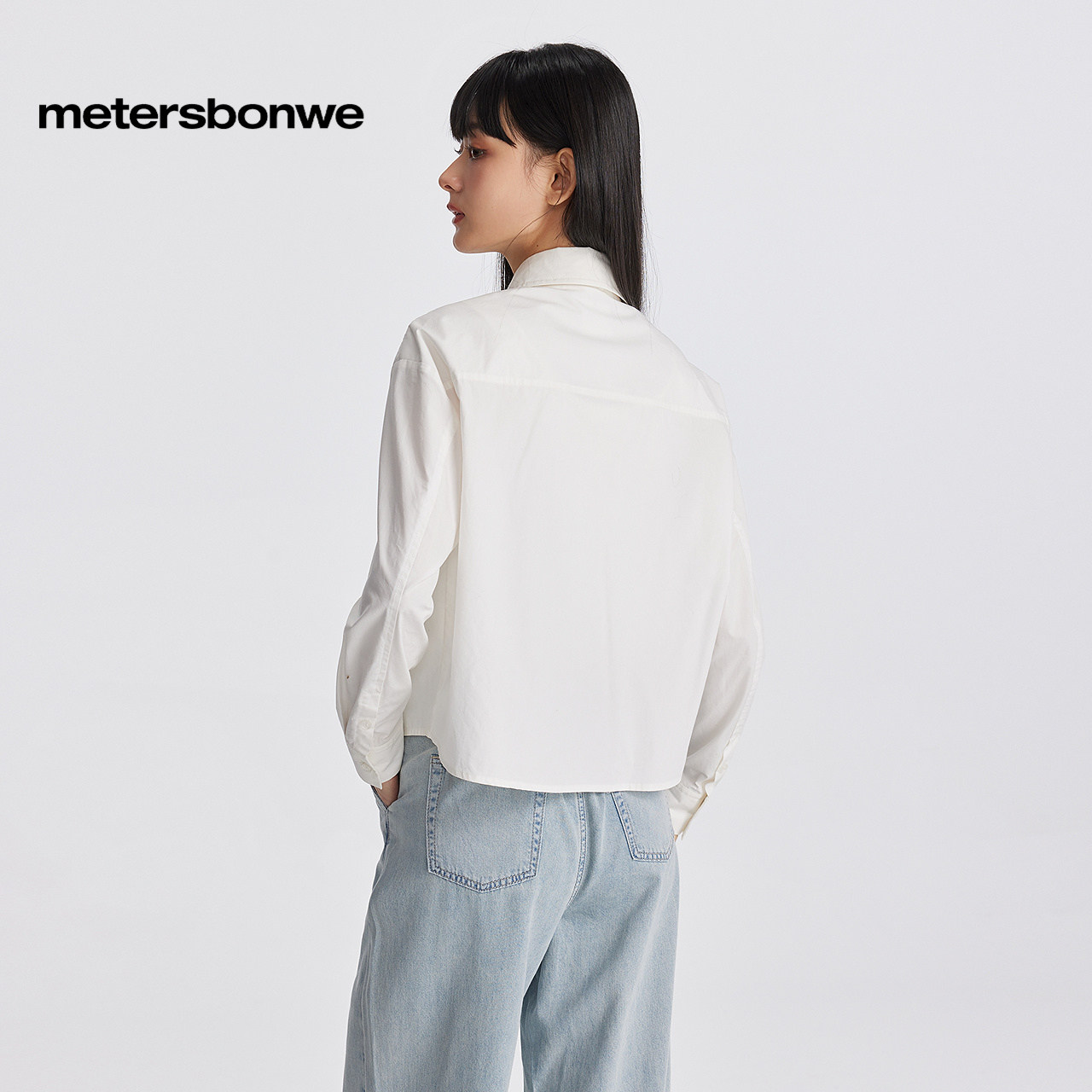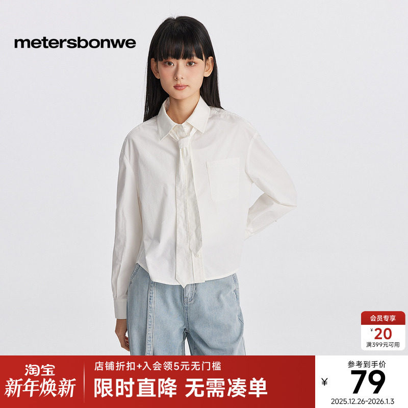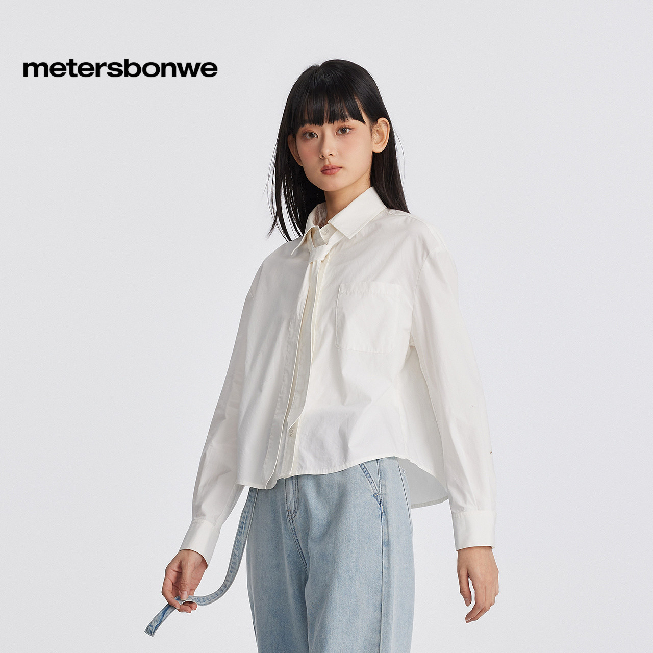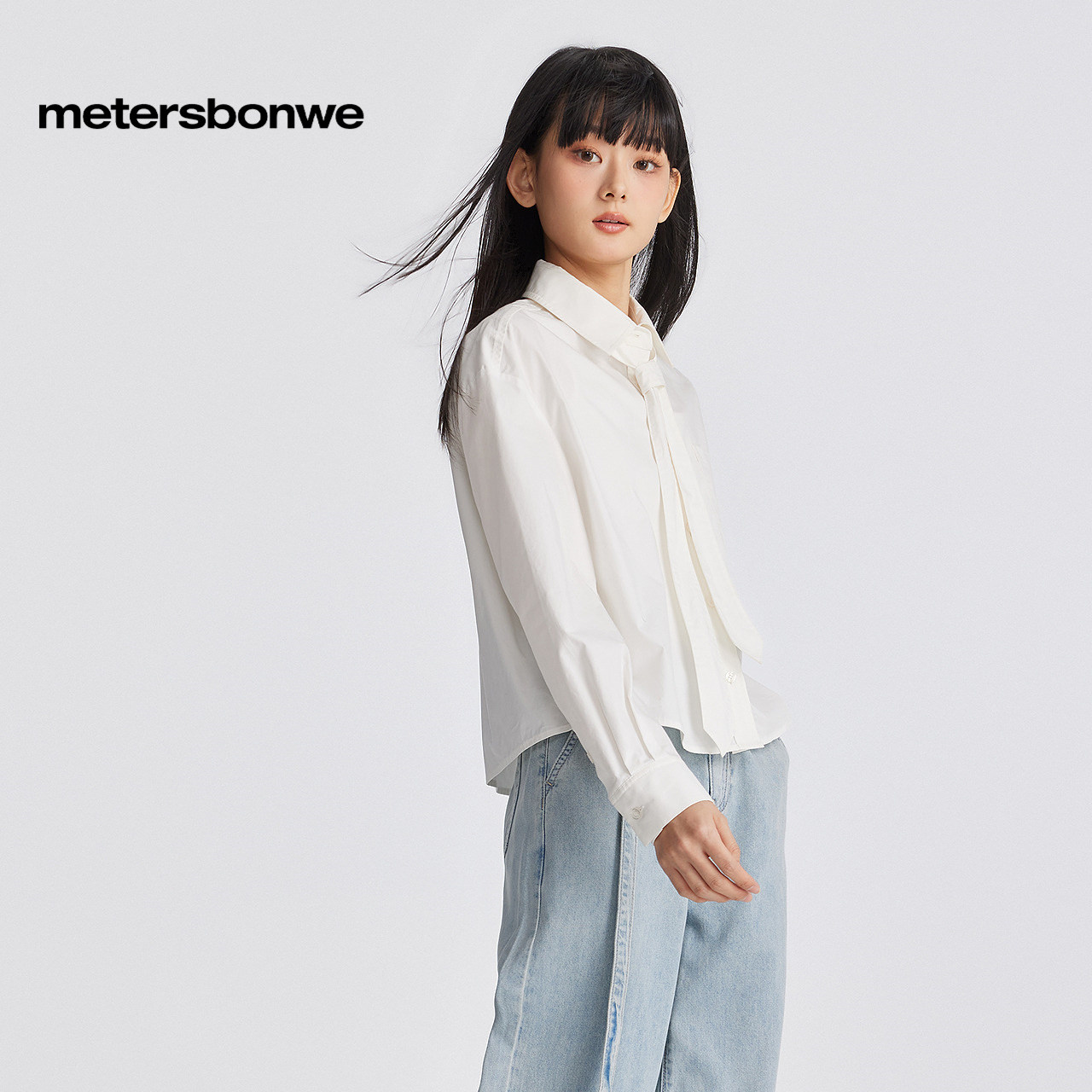 美特斯邦威时尚飘带衬衫女秋冬新款简约百搭贴袋长袖宽松学院上衣