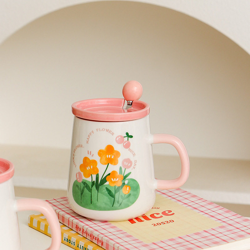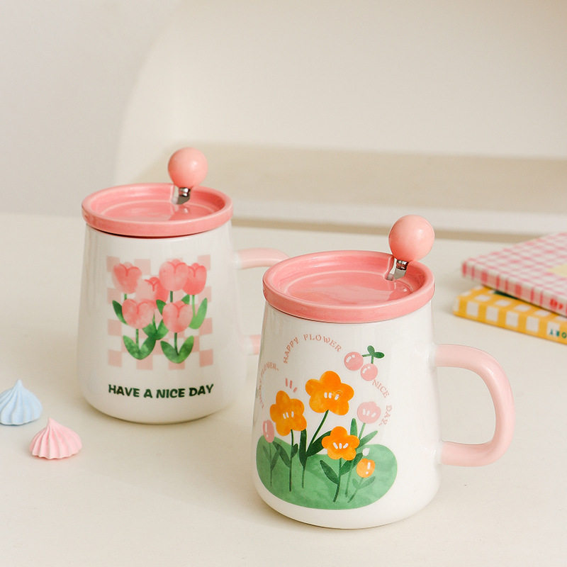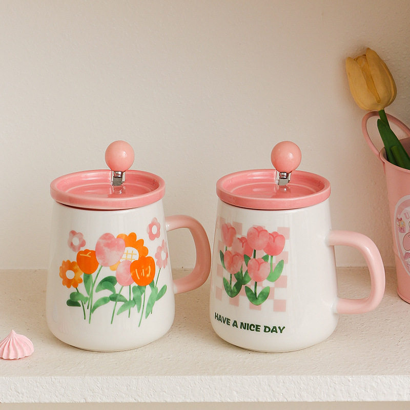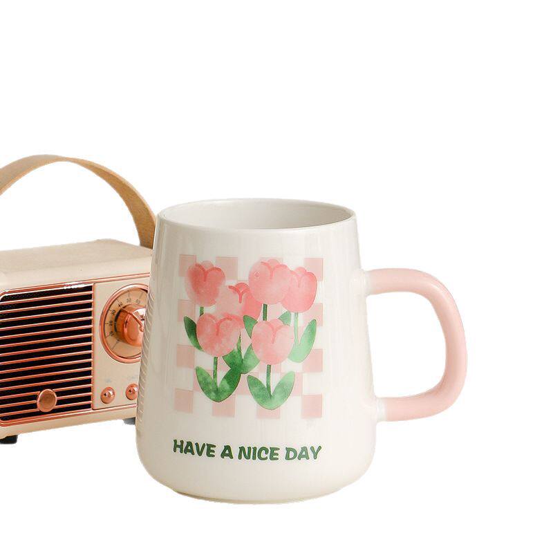 ins郁金香高颜值喝水杯早餐杯陶瓷粉嫩少女心早餐牛奶杯女生带盖