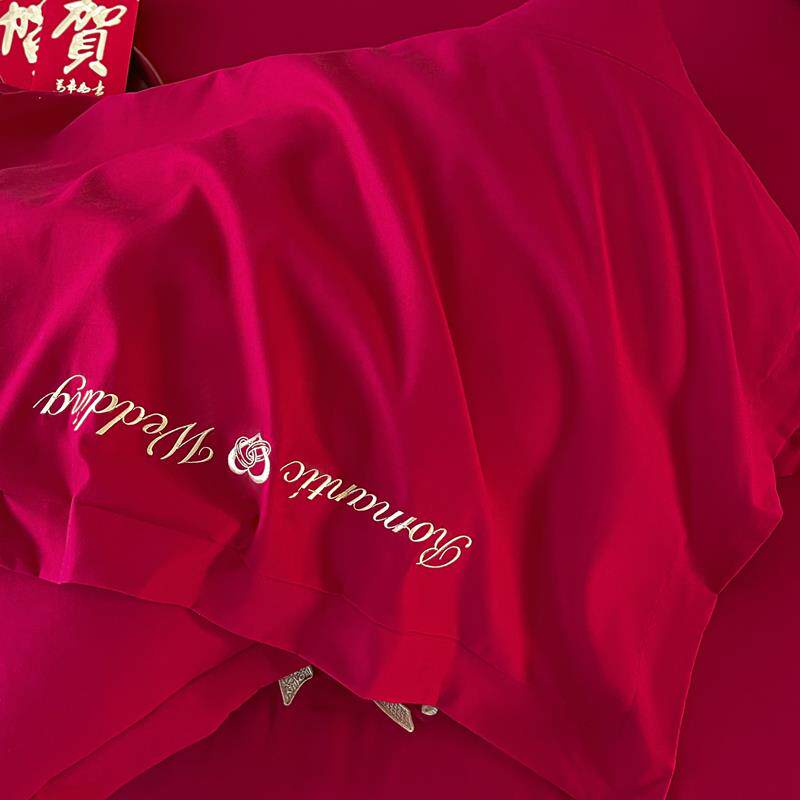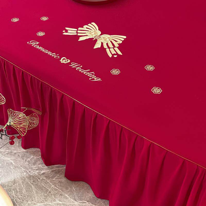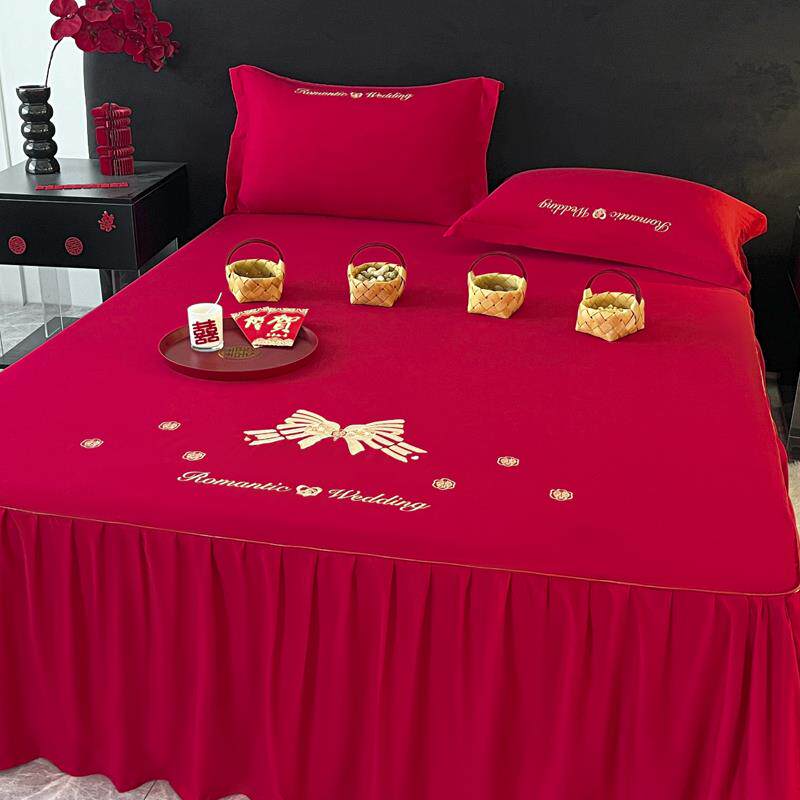 大红色床裙三件套婚礼婚庆红色婚床床罩绑带款床单带裙边结婚床品