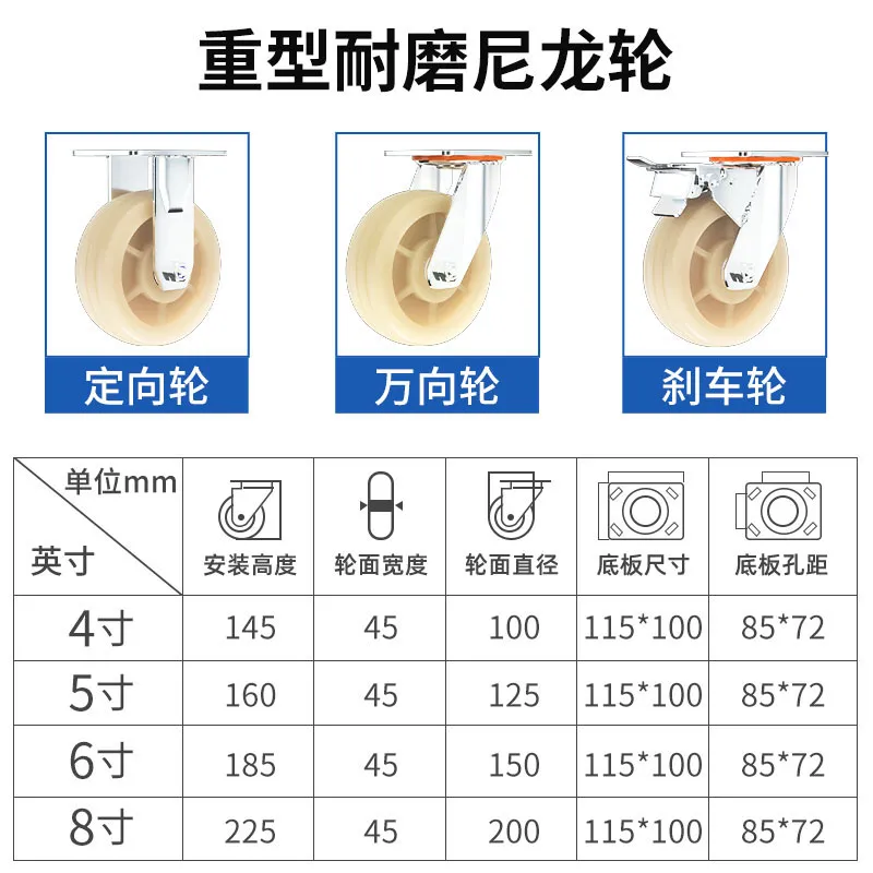 万向轮子尼龙脚轮带刹车定向轱辘平板手推车4568重型承重车轮移动