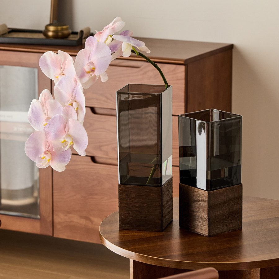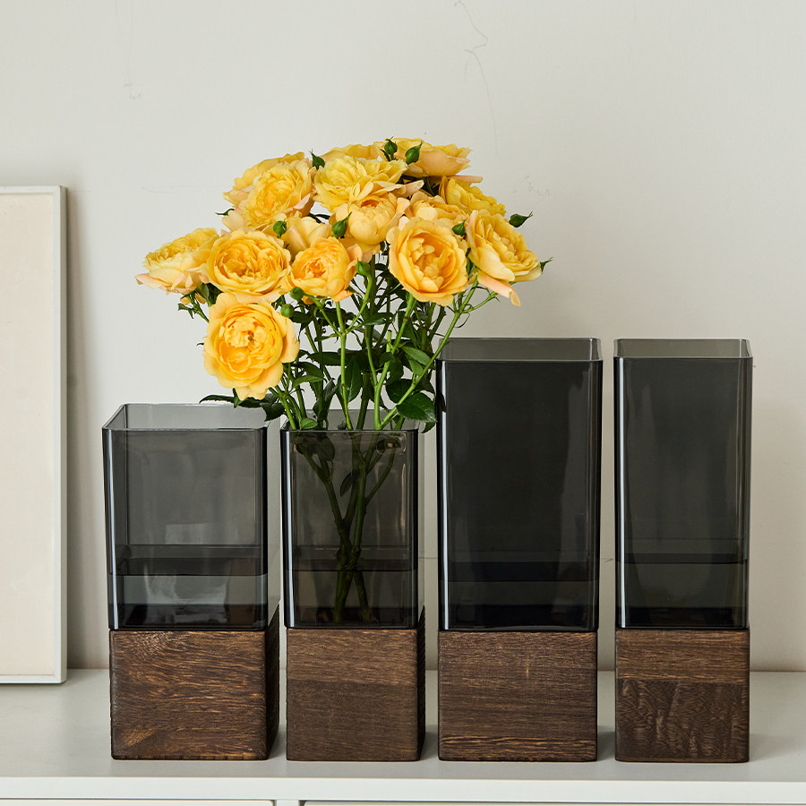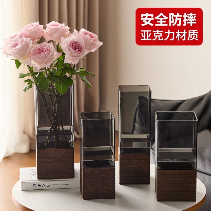 中式木托防摔亚克力花瓶客厅插花摆件装饰轻奢高级感玻璃水培透明