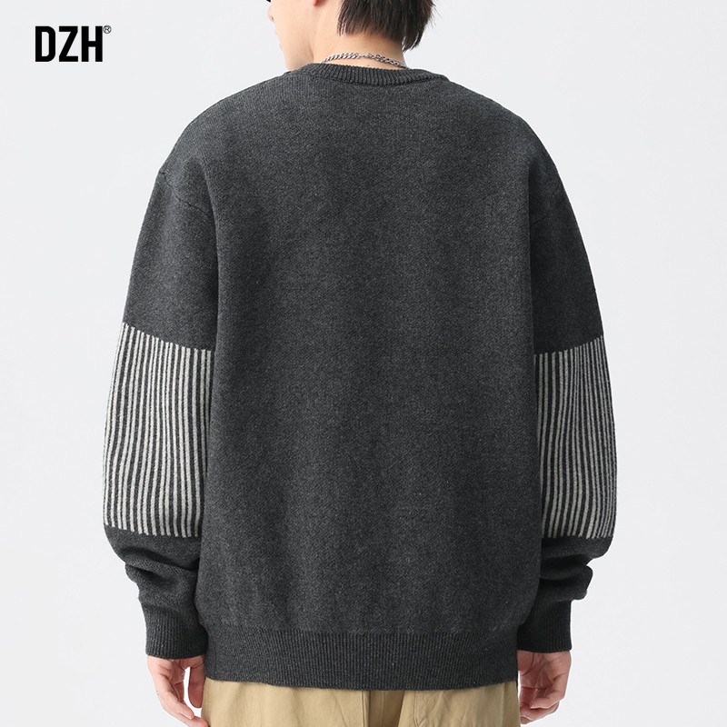 马登工装美式复古竖条纹亨利领毛衣宽松加厚黑色打底针织衫男秋冬