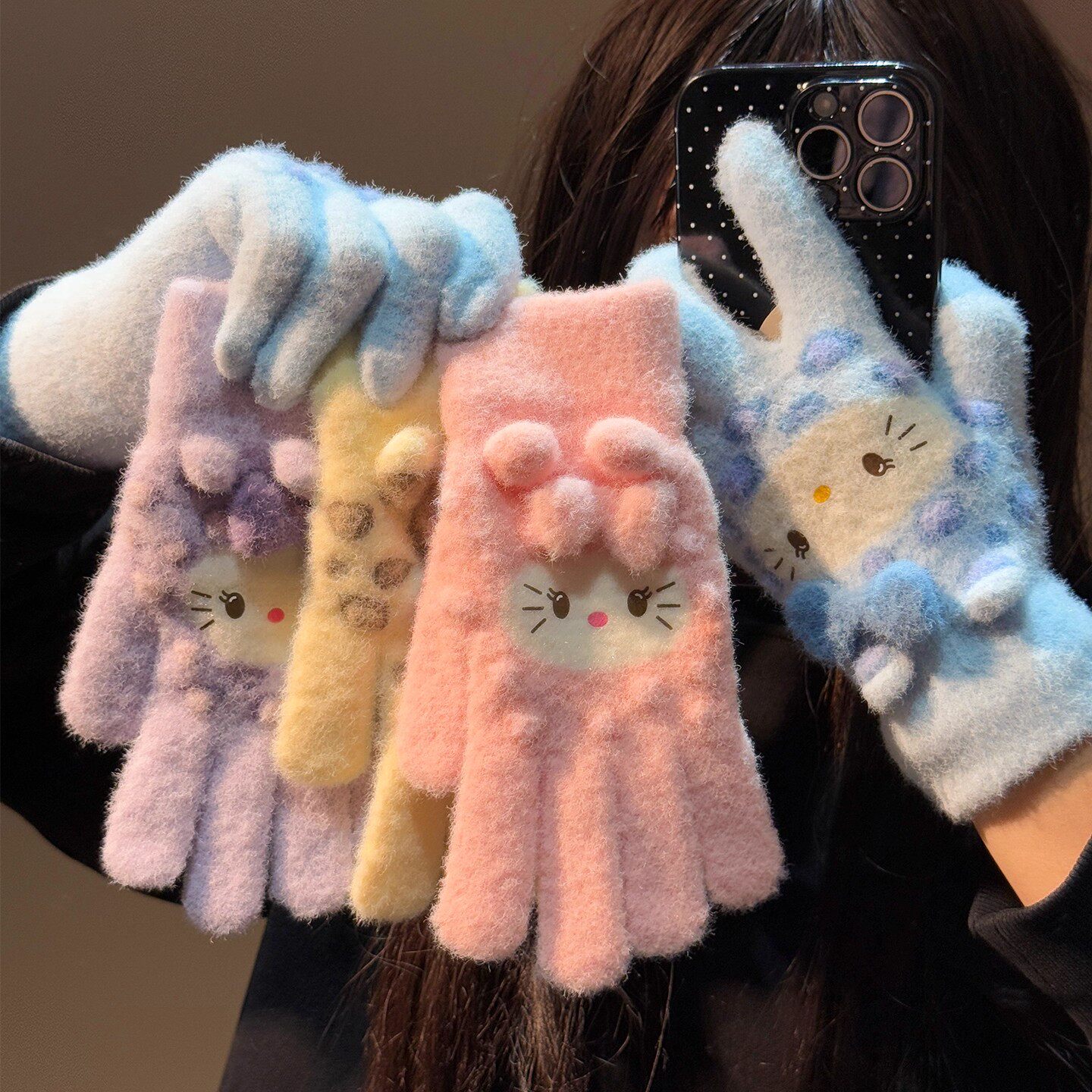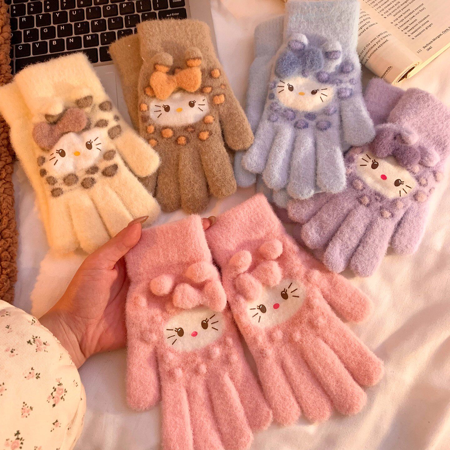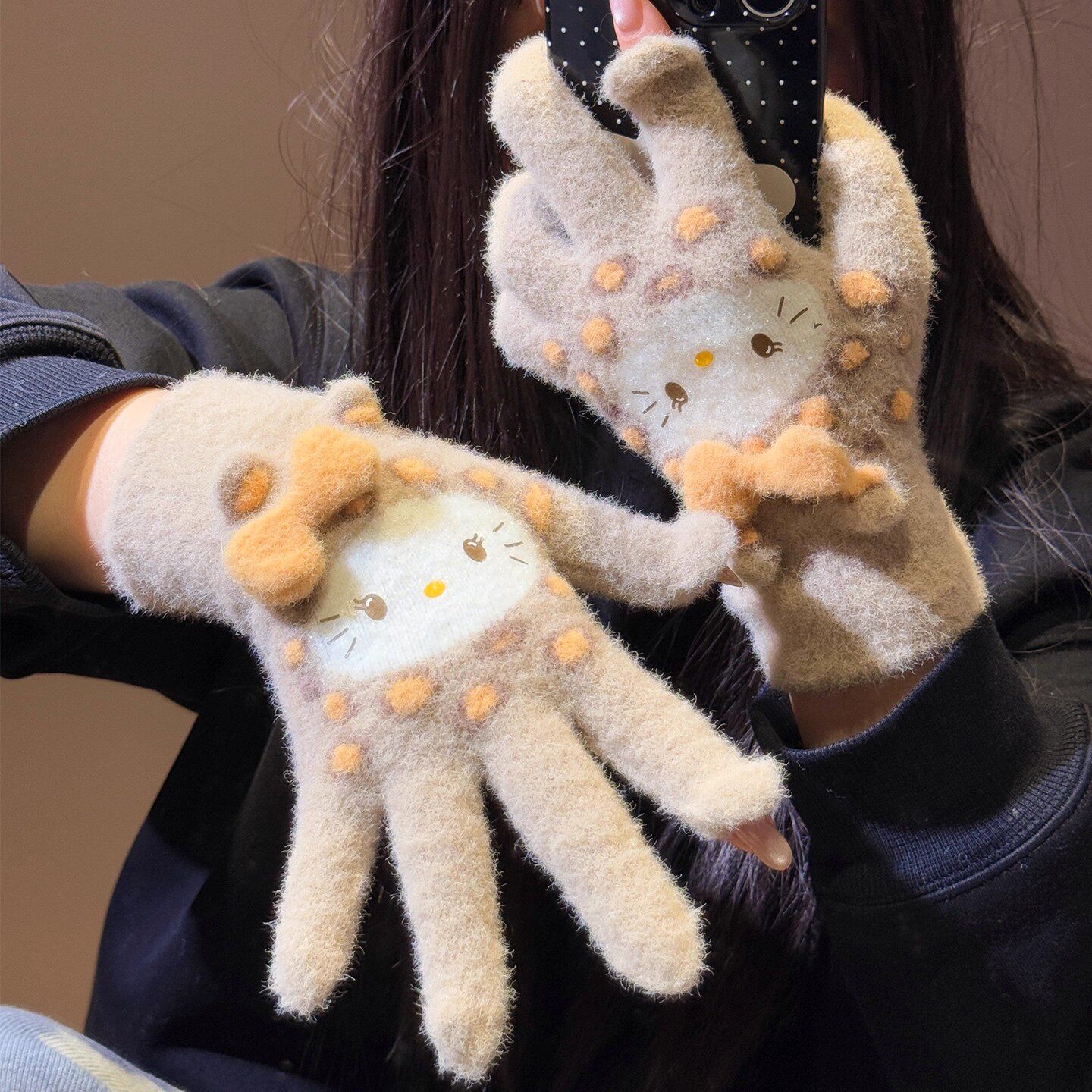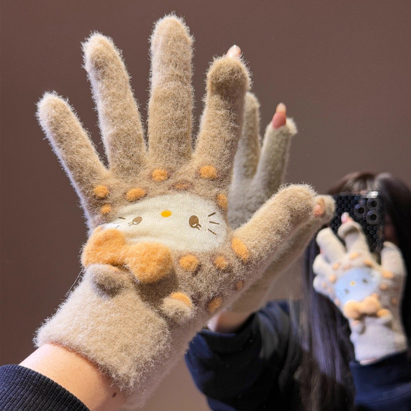 可爱豹纹毛绒手套女冬季加厚保暖防寒露指可触屏骑行学生加绒蓝色