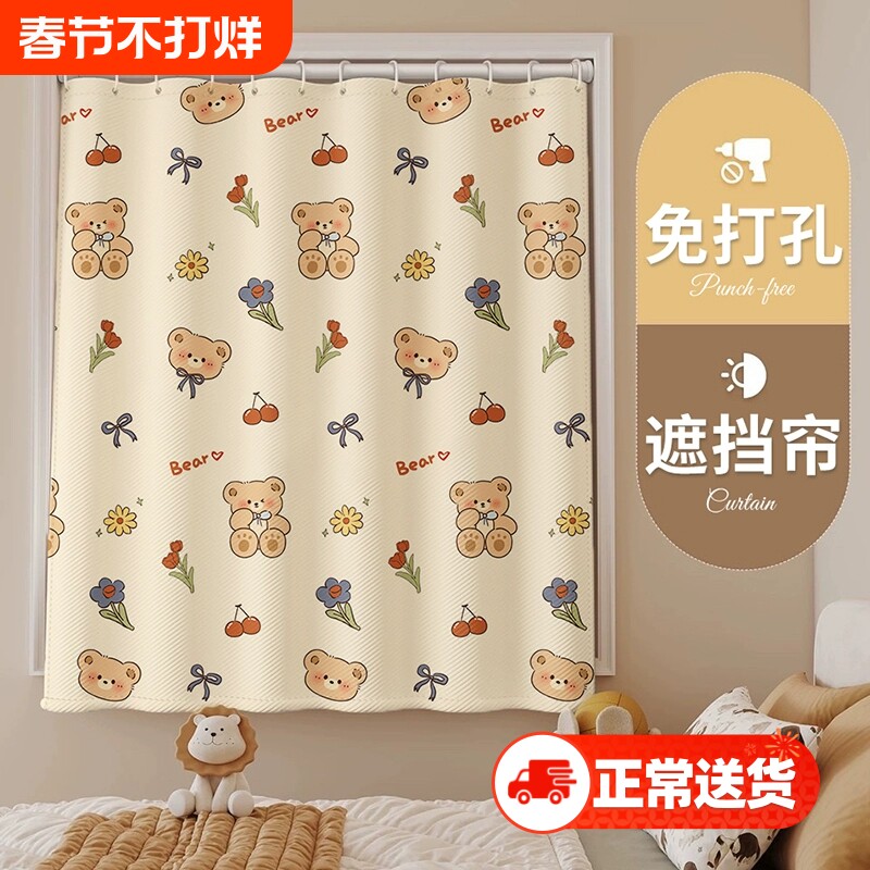 2024窗帘全遮光免打孔伸缩杆新款出租房卧室遮阳卫生间隔断遮挡帘