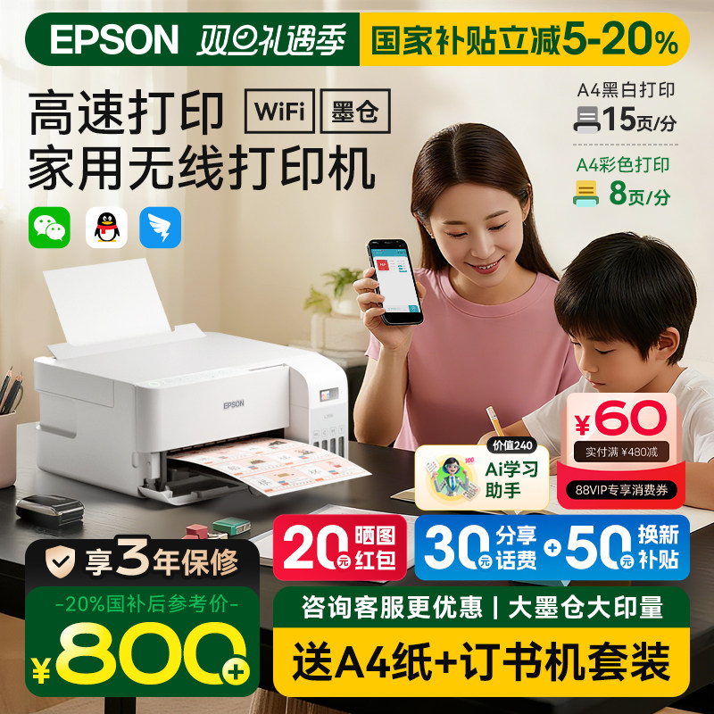 【政府补贴】爱普生家用小型墨仓式L3556/L3558/L3266/L4263/69彩色喷墨打印机无线连供办公复印扫描