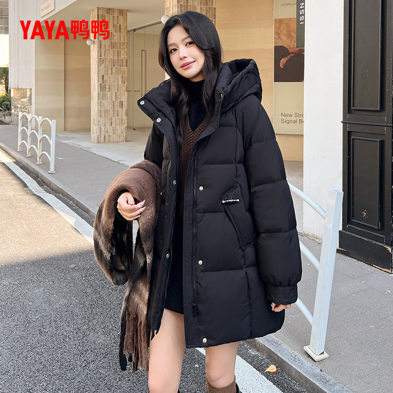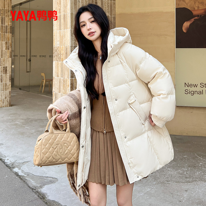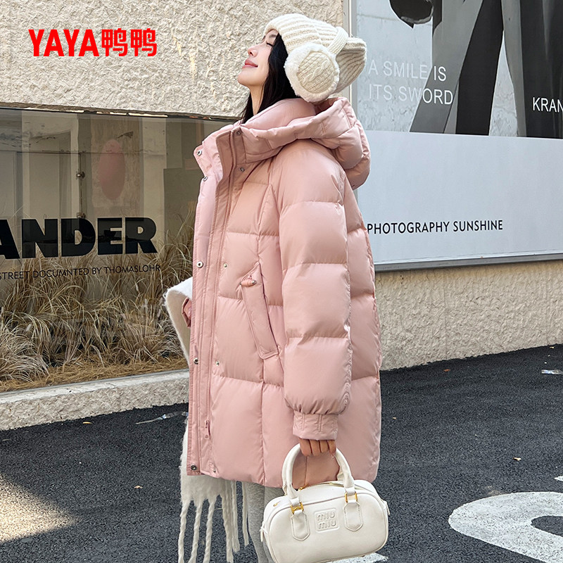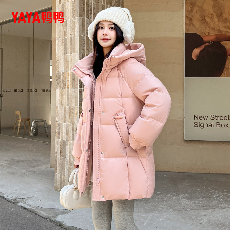 鸭鸭羽绒服女士2025冬季新品中长款连帽时尚休闲宽松鸭绒羽绒服S