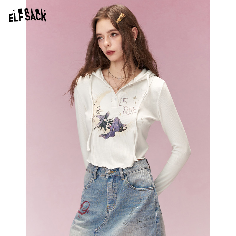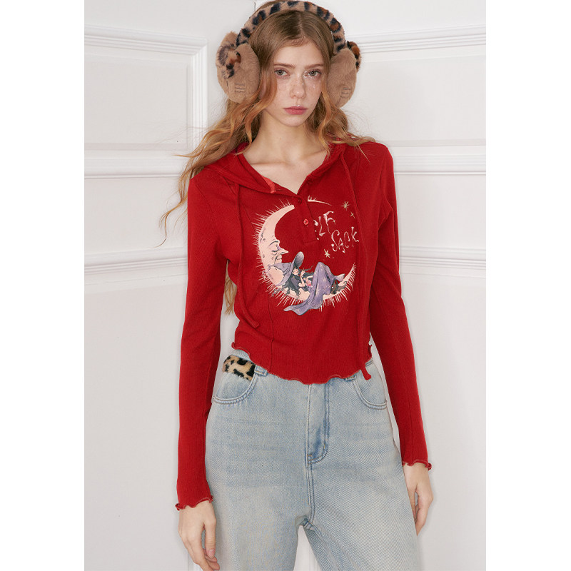 妖精的口袋红色印花连帽t恤女2025冬季新款内搭修身上衣新年战袍