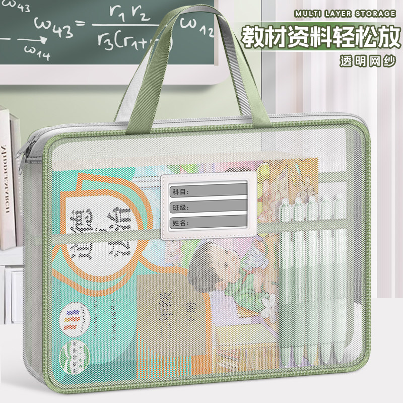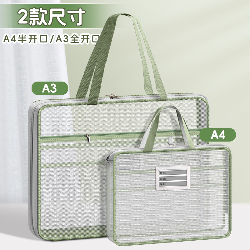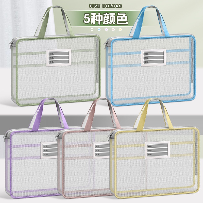 A3大开口手提L型文件袋多隔层公文包拉链式网袋简约透明大容量网纱手拎书袋补习袋资料笔记本学生试卷收纳袋