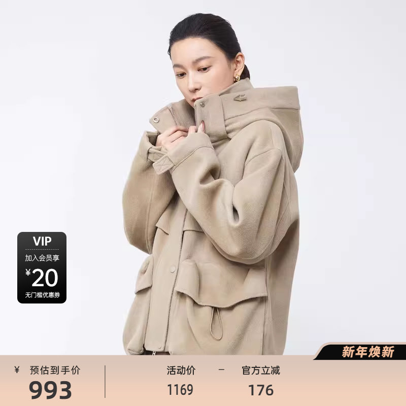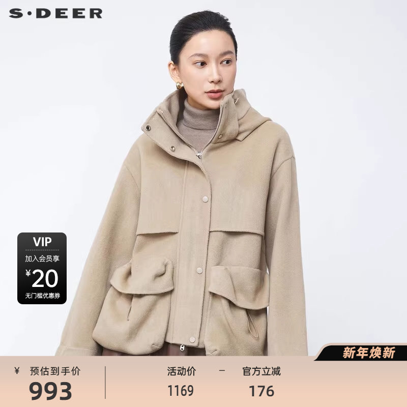 sdeer圣迪奥女装高领连帽抽绳羊毛双面呢夹克S24482611