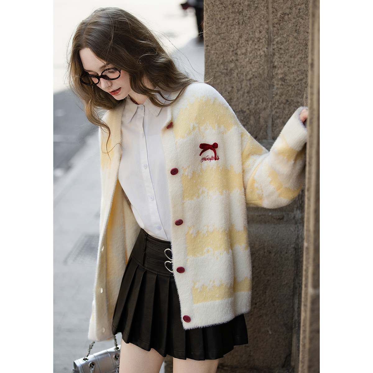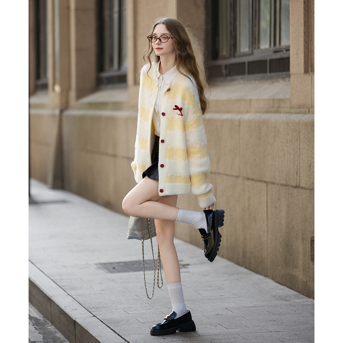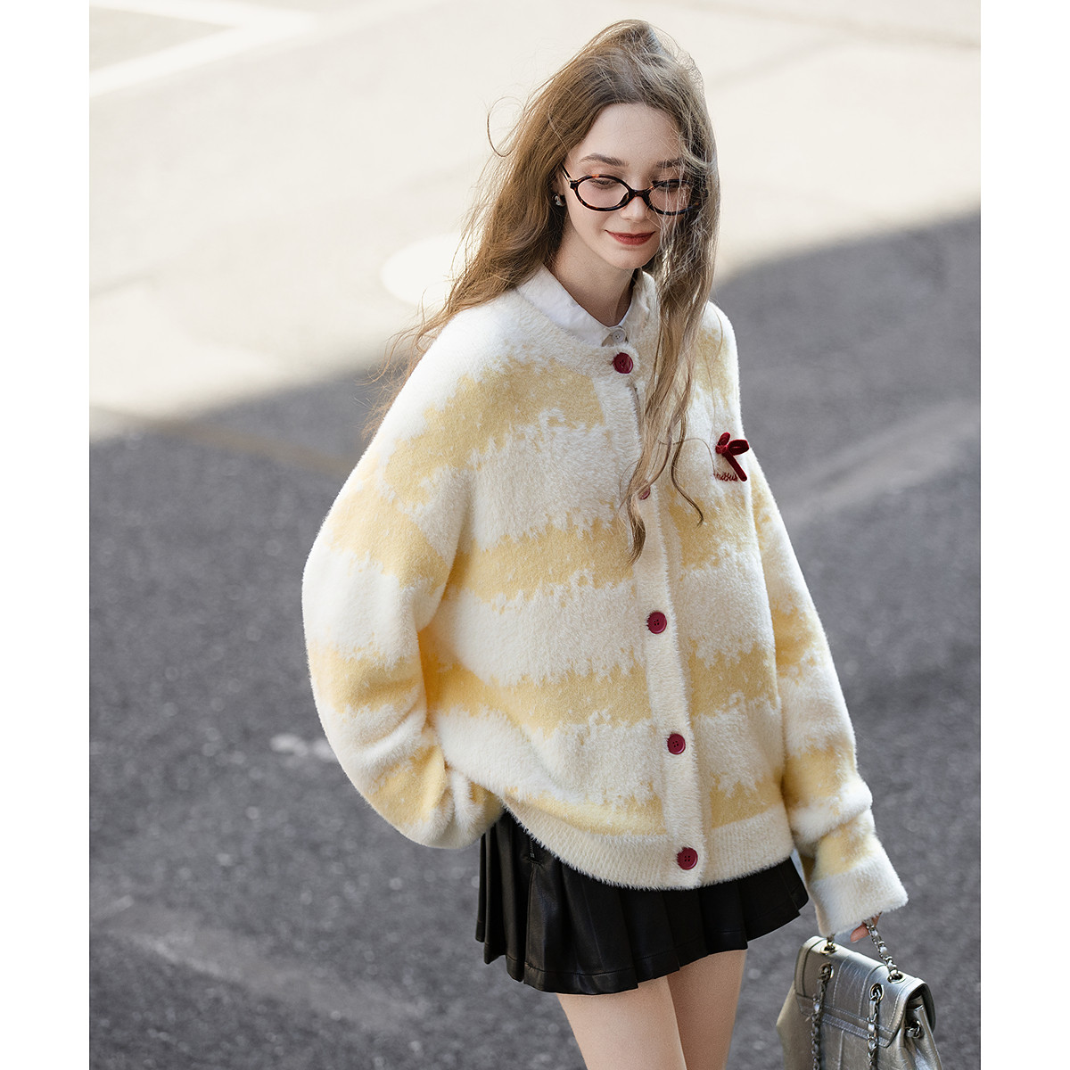 唐狮秋冬女毛衣圆领双色渐变提花可爱蝴蝶结甜美约会穿搭好看tuTA
