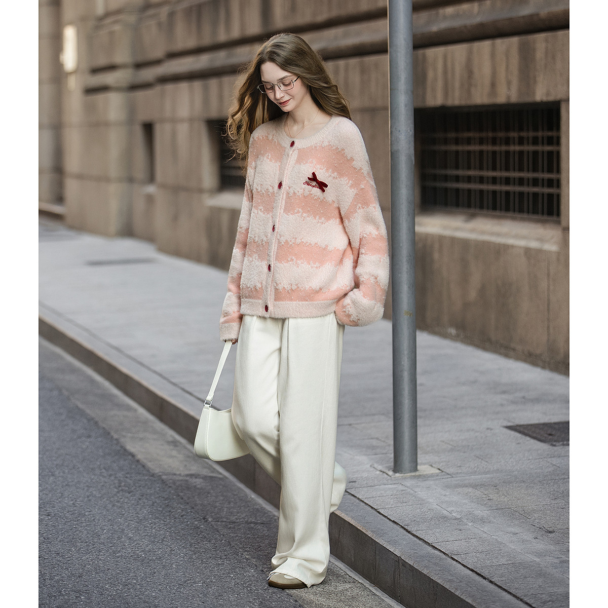三福毛衣开衫女2025新款冬季星星绣花连帽条纹宽松外套女装509744
