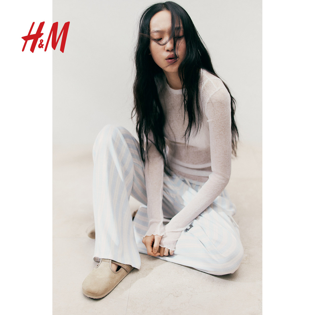 HM女装休闲裤春季低腰简约潮流松紧腰抽绳直筒裤1261667