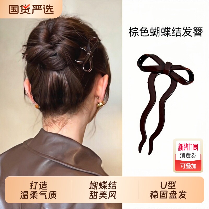 棕色蝴蝶结发簪设计感U型丸子头发钗气质后脑勺盘发簪子新品发饰