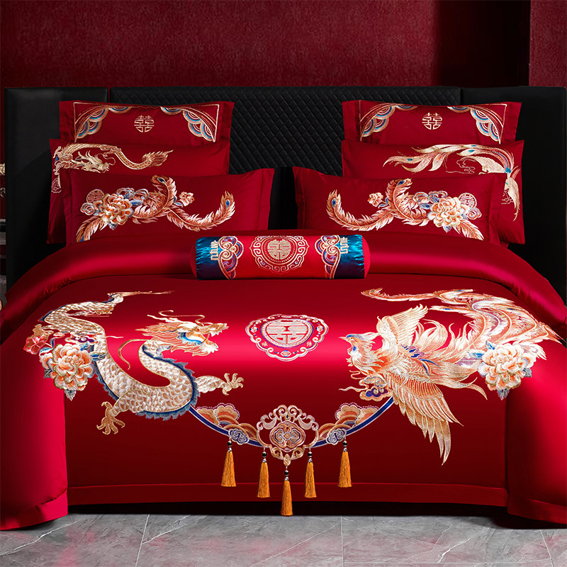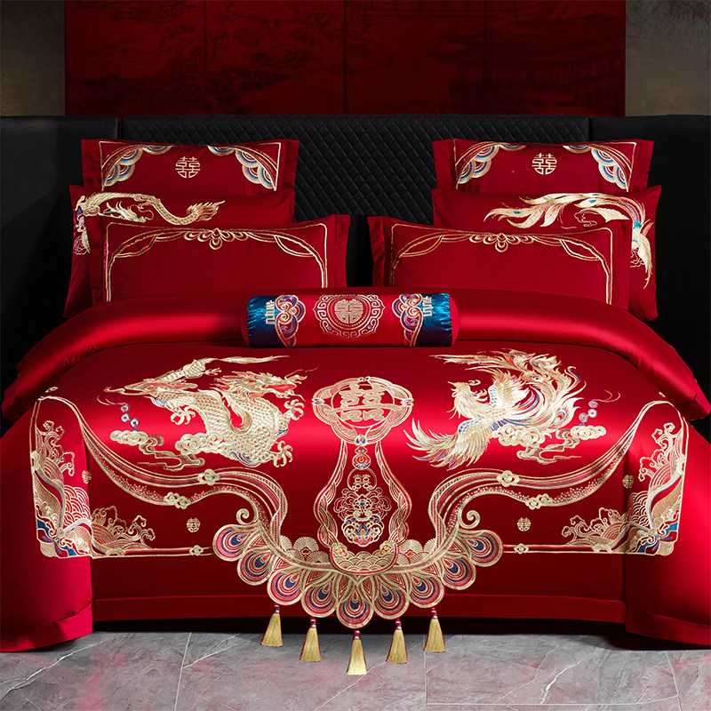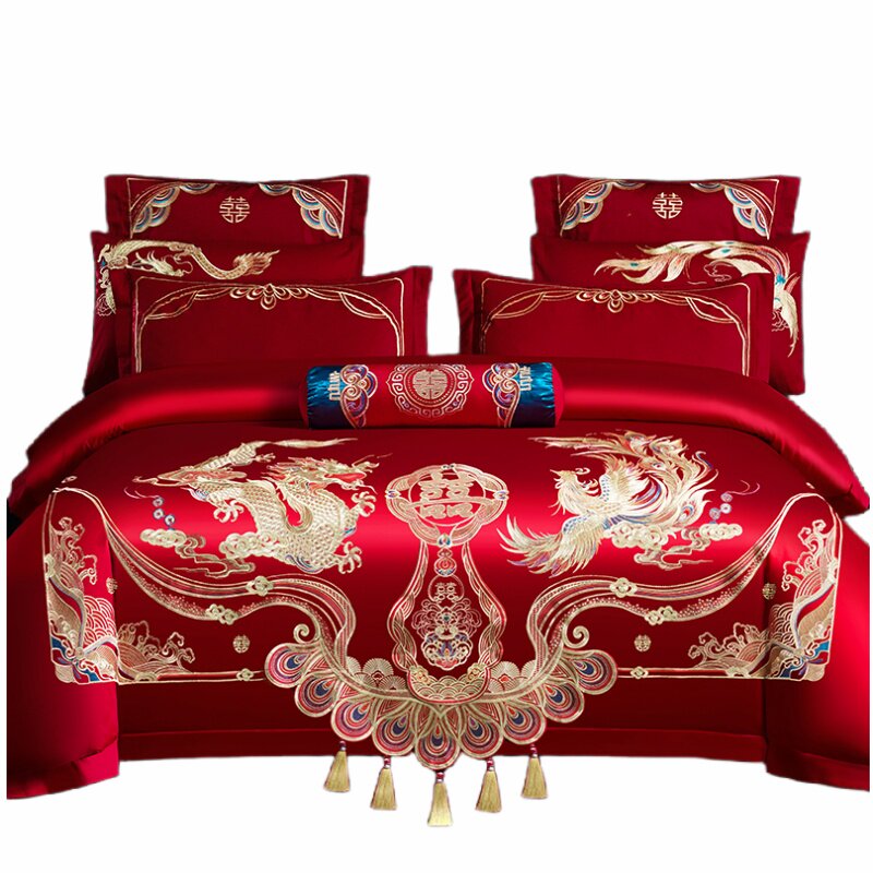 140支高端婚庆四件套长绒棉大红龙凤刺绣全棉新结婚房床品八十件