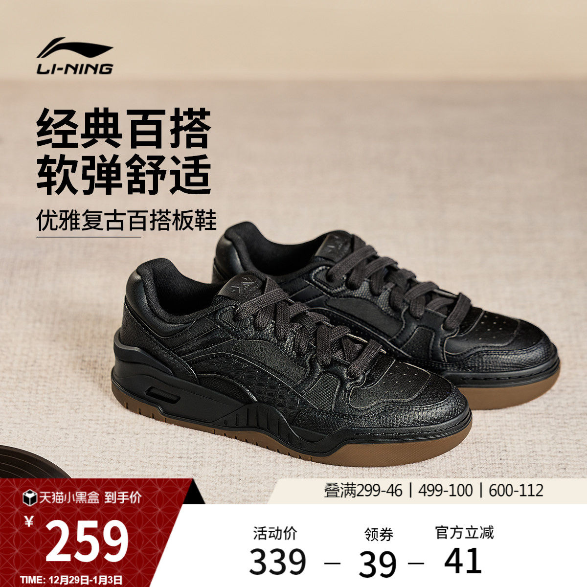 李宁月白2 | 板鞋男款秋冬复古百搭黑色休闲鞋情侣白色运动鞋女鞋