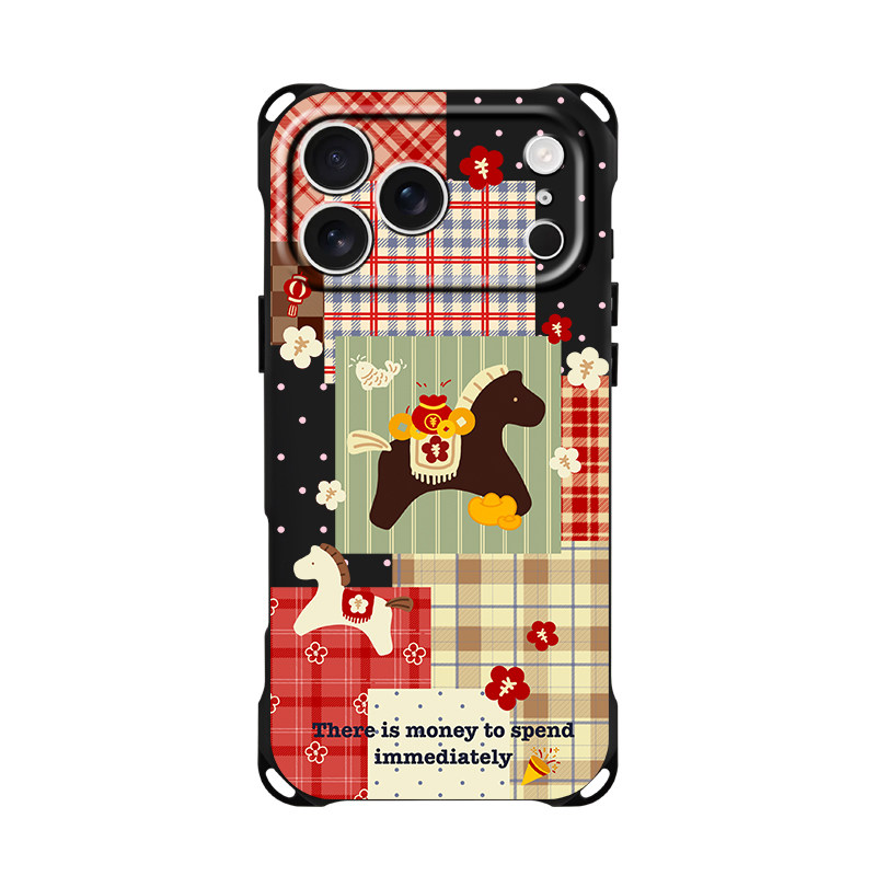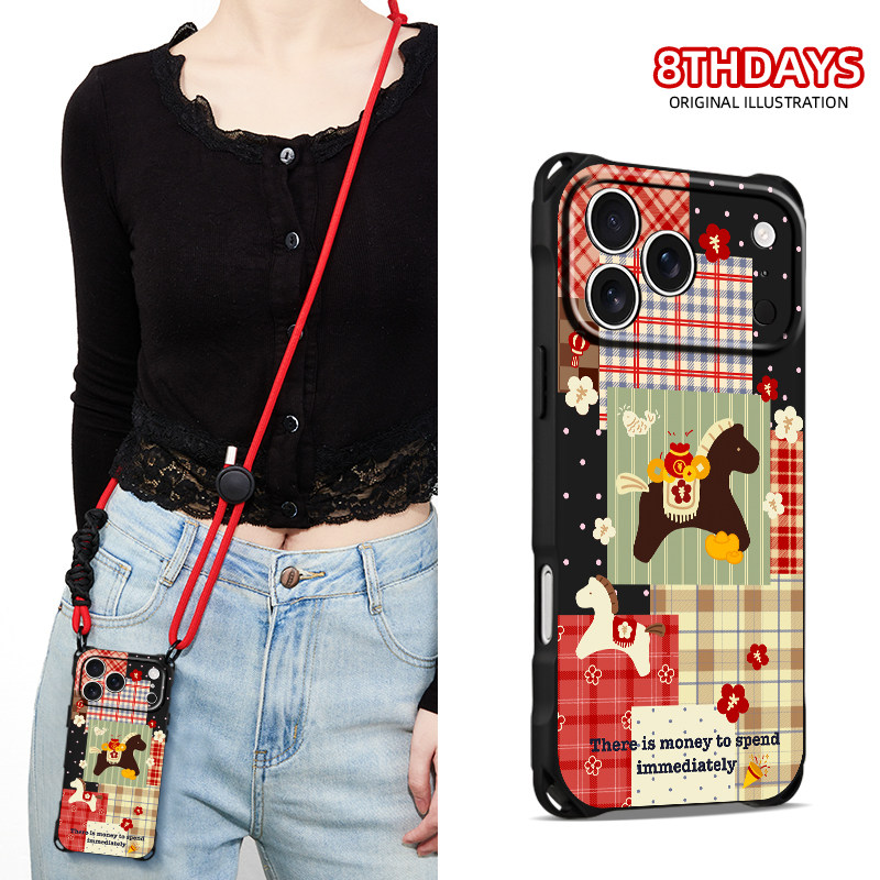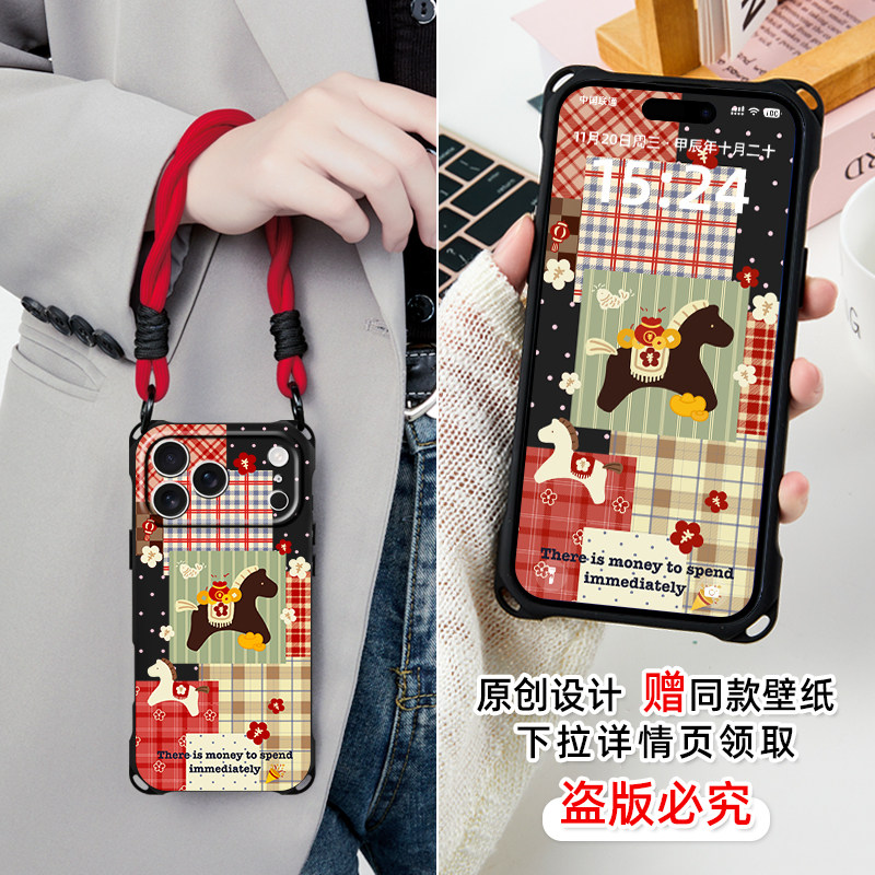 新款发发马复古拼贴挂绳手机壳适用苹果17pro16镜头全包14可斜挎13高级女款12秋冬华为pura80格纹小米15手提