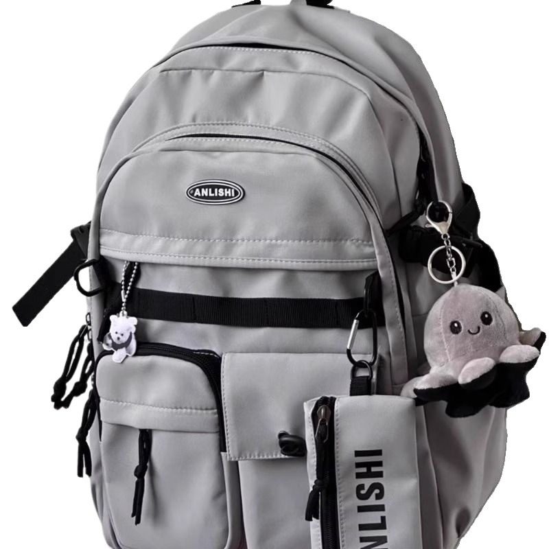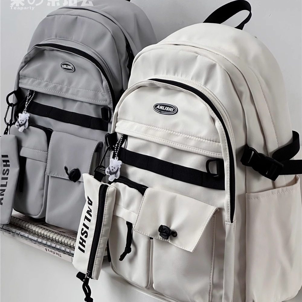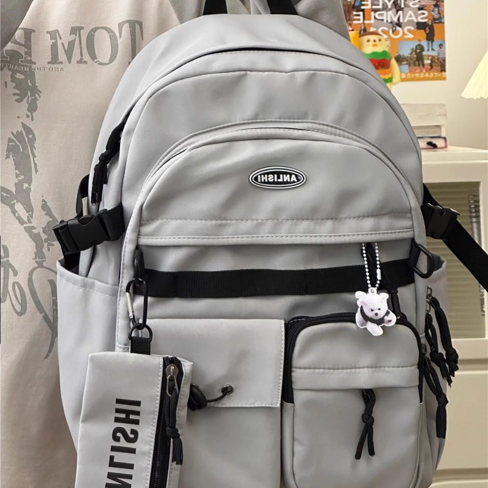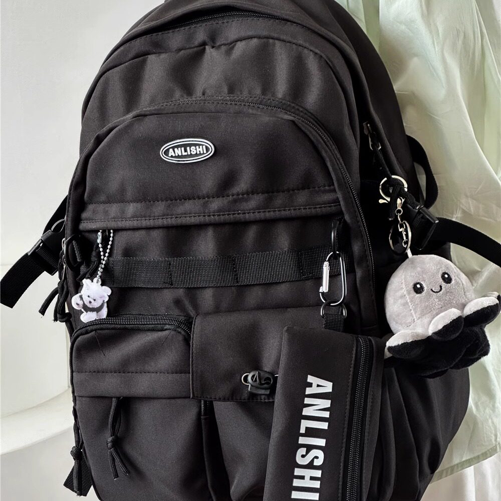 日系高颜值工装书包女学生大容量防水双肩包电脑背包男潮黑色