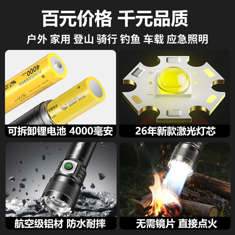 微笑鲨手电筒强光小型便携超亮长续航大容量远射充电式家用户外