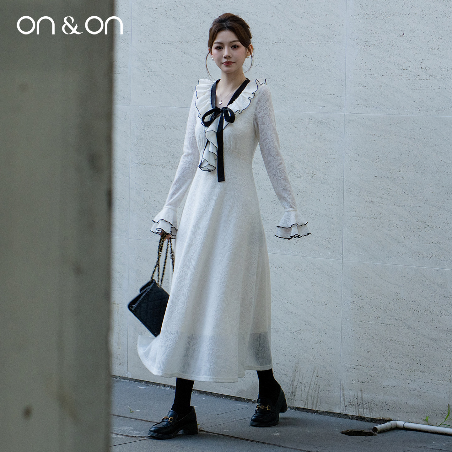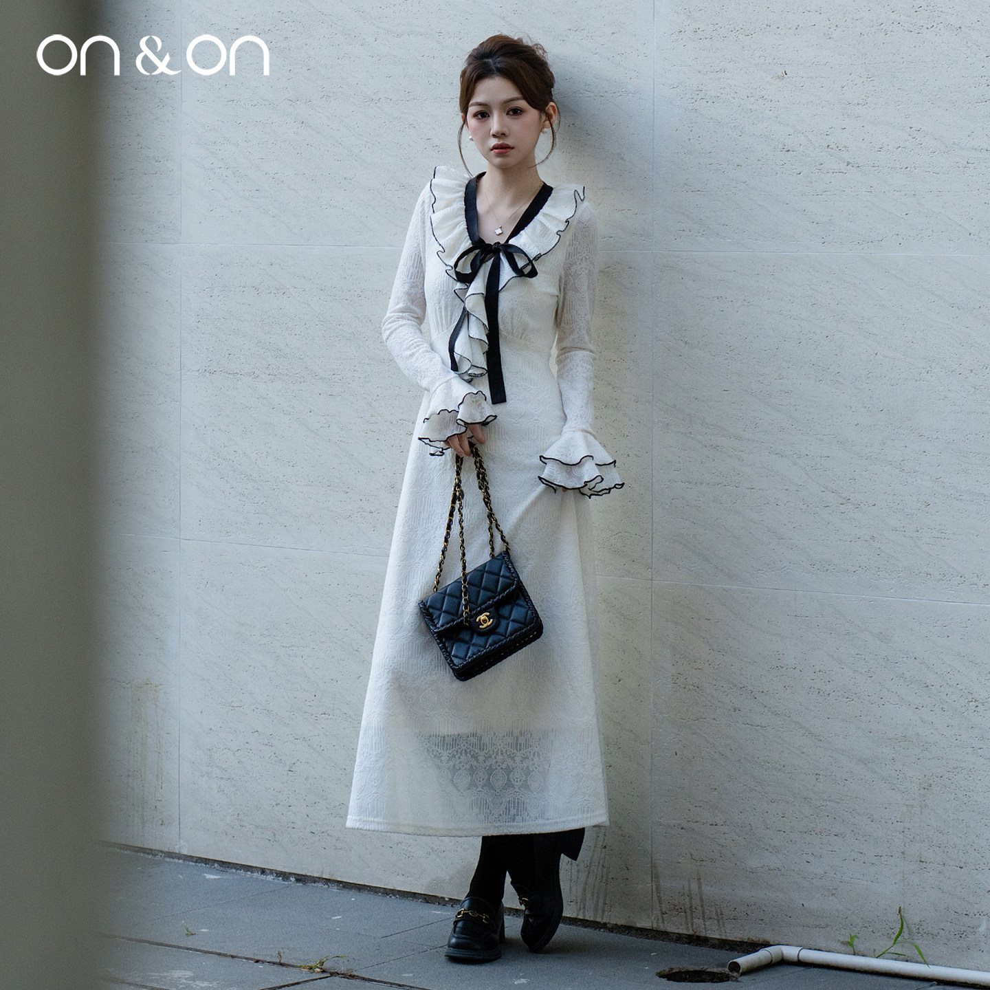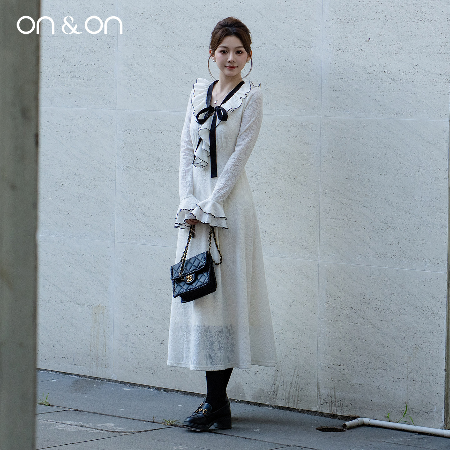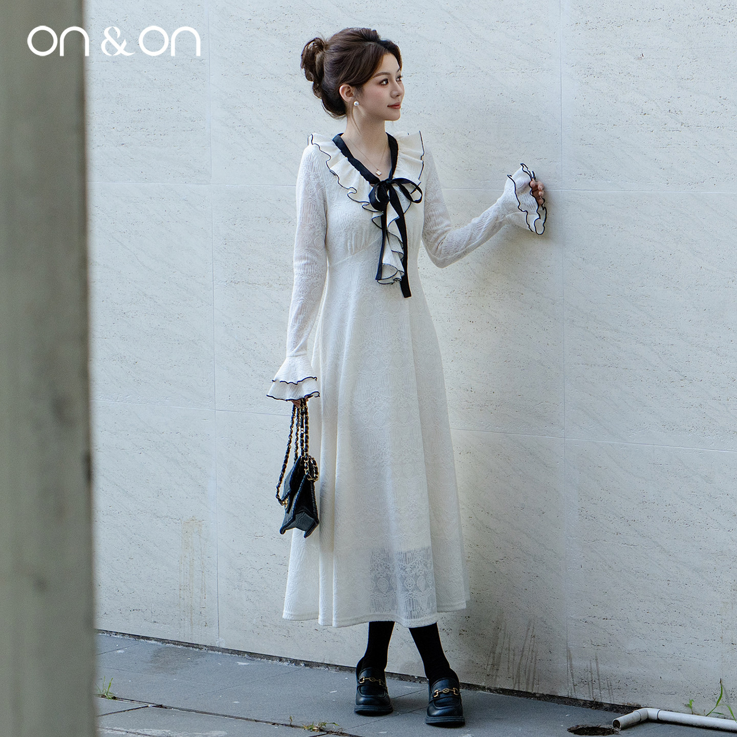 ON&ON/安乃安2025冬季新款韩系荷叶边领系带蝴蝶结针织加绒长裙