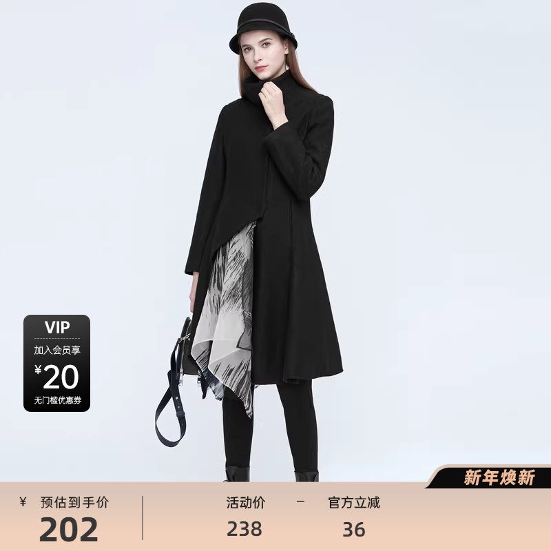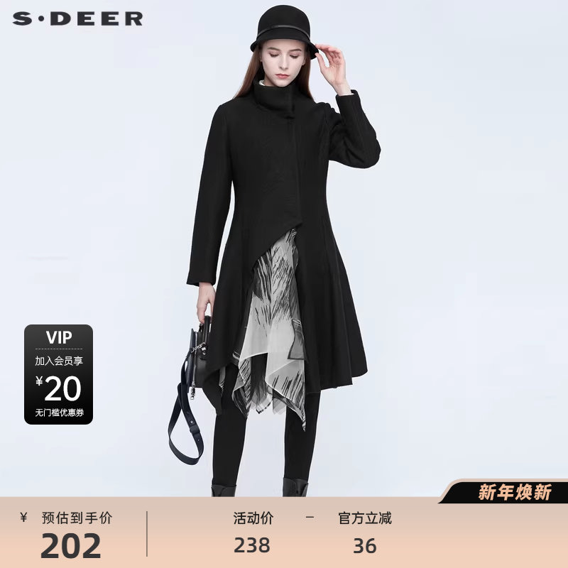 sdeer圣迪奥女装毛呢大衣时尚立领不规则拼接风衣外套S20481826